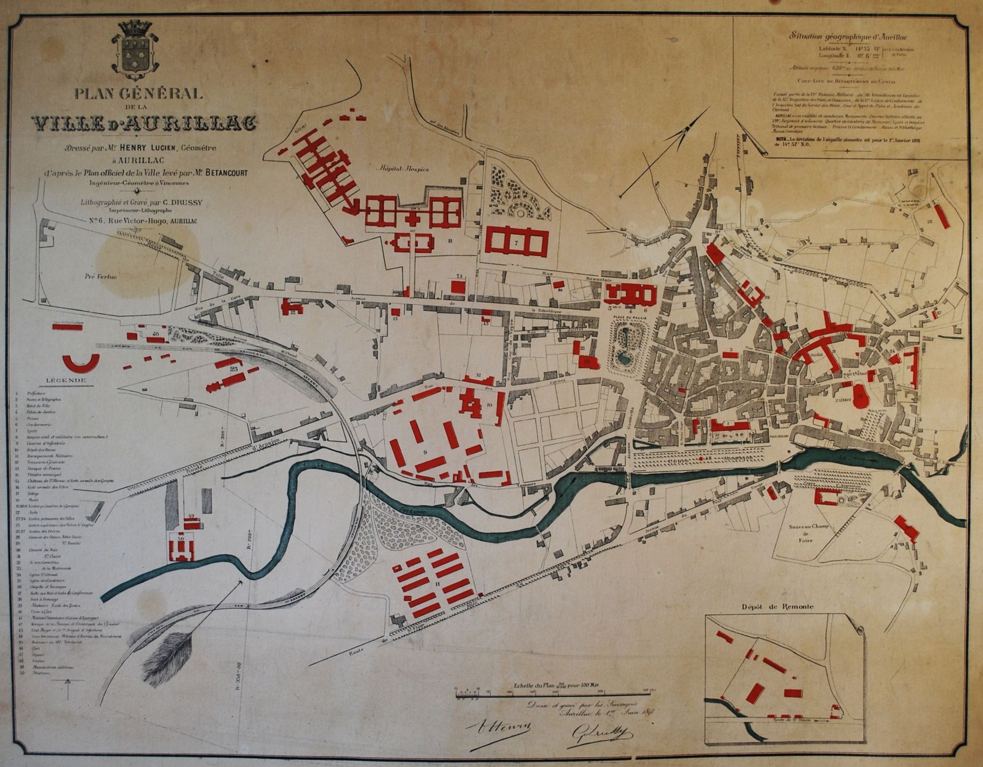 Dressé par Lucien Henry, géomètre à Aurillac et gravé par G. Drussy, imprimeur-lithographe à Aurillac, ce plan montre une Dorinière vierge de toute occupation, mais traversée par le canal des usiniers et entourée de bâtiments publics : « École supérieure des Frères Saint-Eugène », la manutention militaire et les abattoirs. Sur la route d’Arpajon (future avenue des Pupilles de la Nations) et au début de la rue des Tanneurs (future rue Paul Doumer), s’élèvent quelques maisons d’habitations.