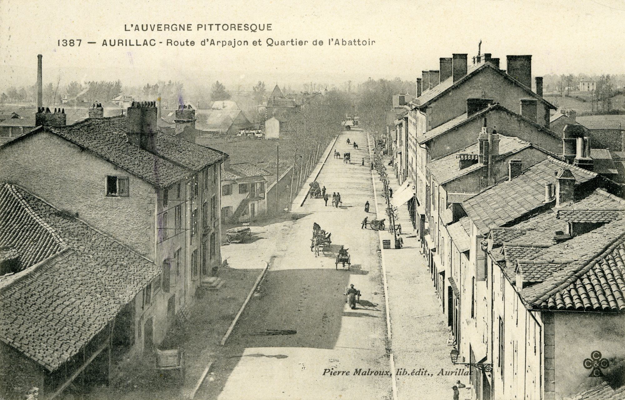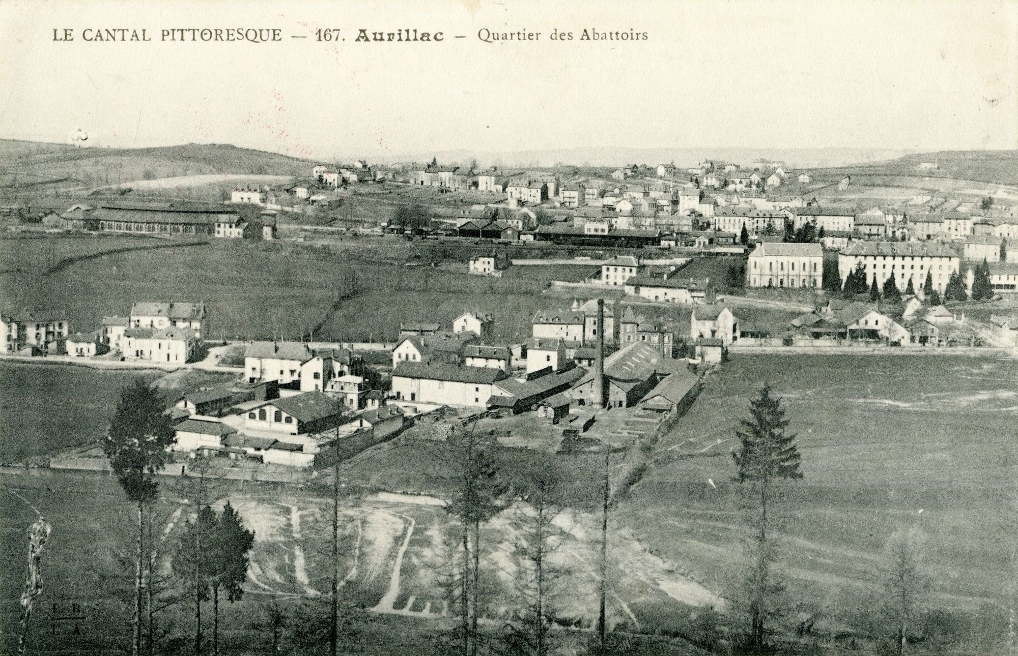 Prise depuis la route de Vic-sur-Cère, cette carte postale hivernale du « Cantal pittoresque » montre une parcelle entièrement vierge, délimitée par la briqueterie Rispalà gauche, la route d’Arpajon au-dessus et le coin en bas à droite de l’image. Durant l’hiver, ce pré est largement inondé. À gauche de la briqueterie se trouve l’abattoir, qui donne son nom à la carte postale.