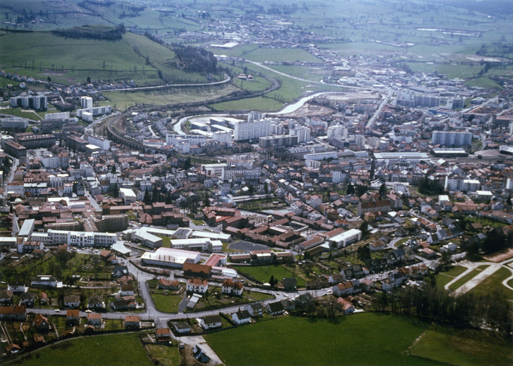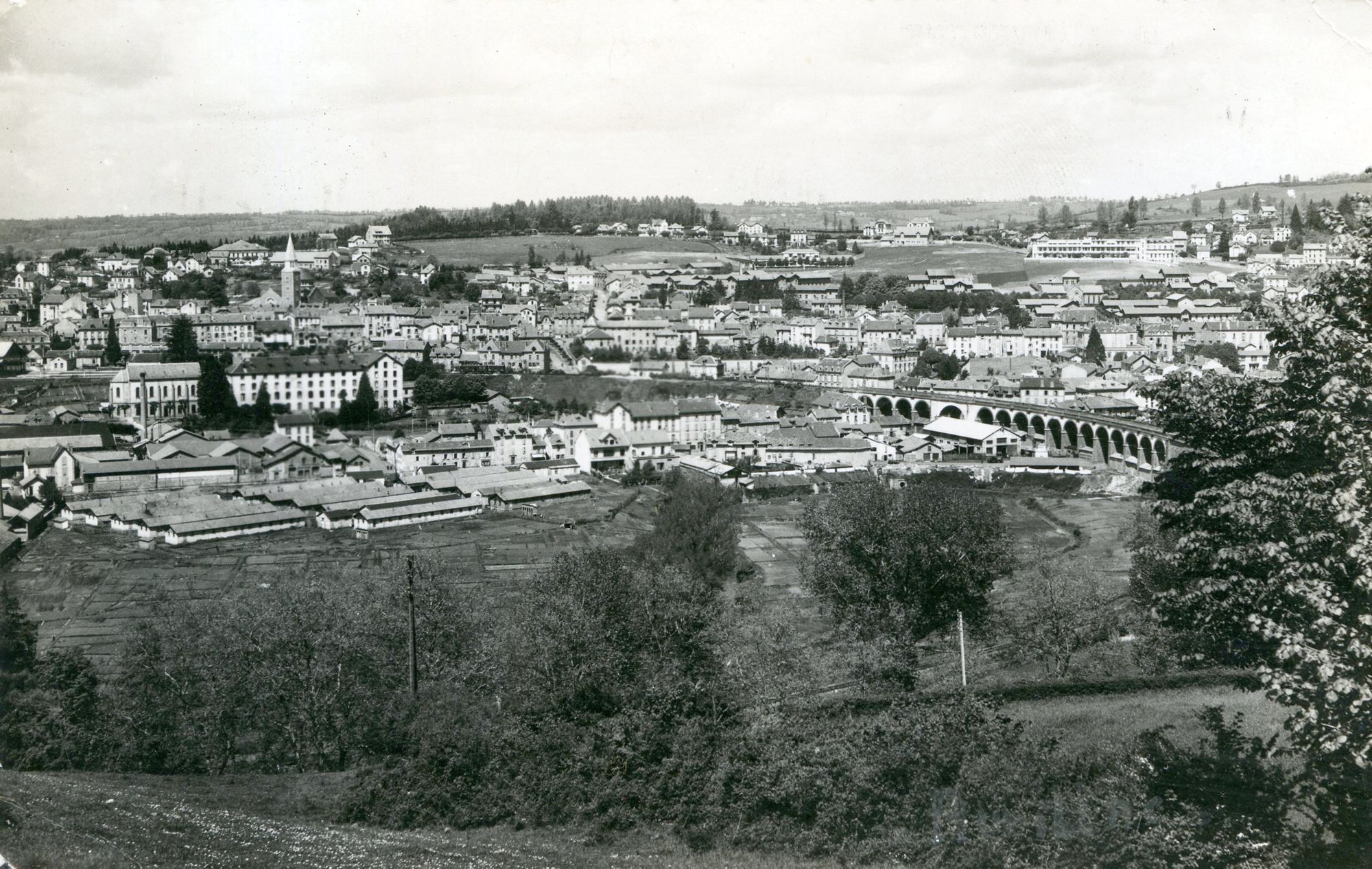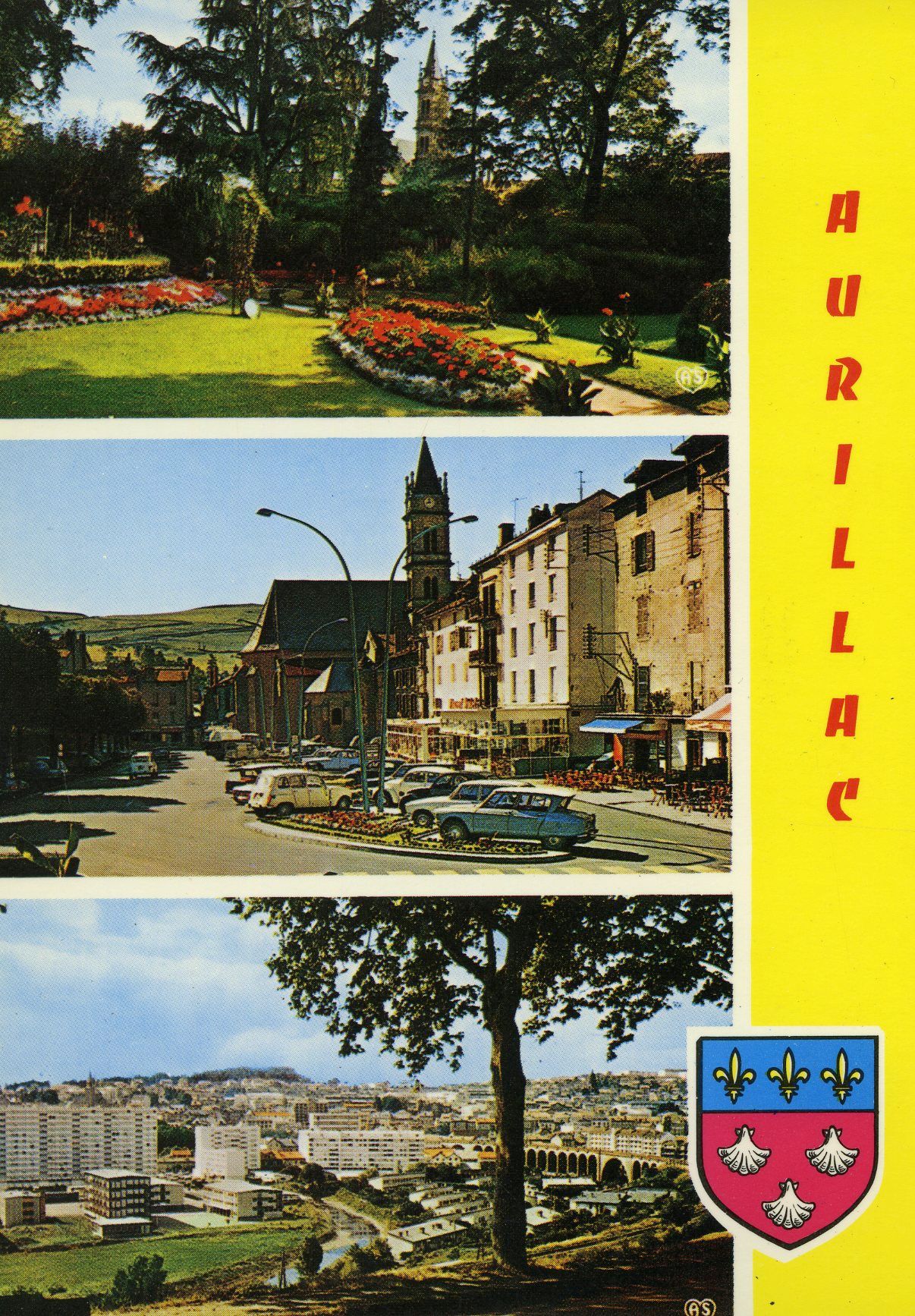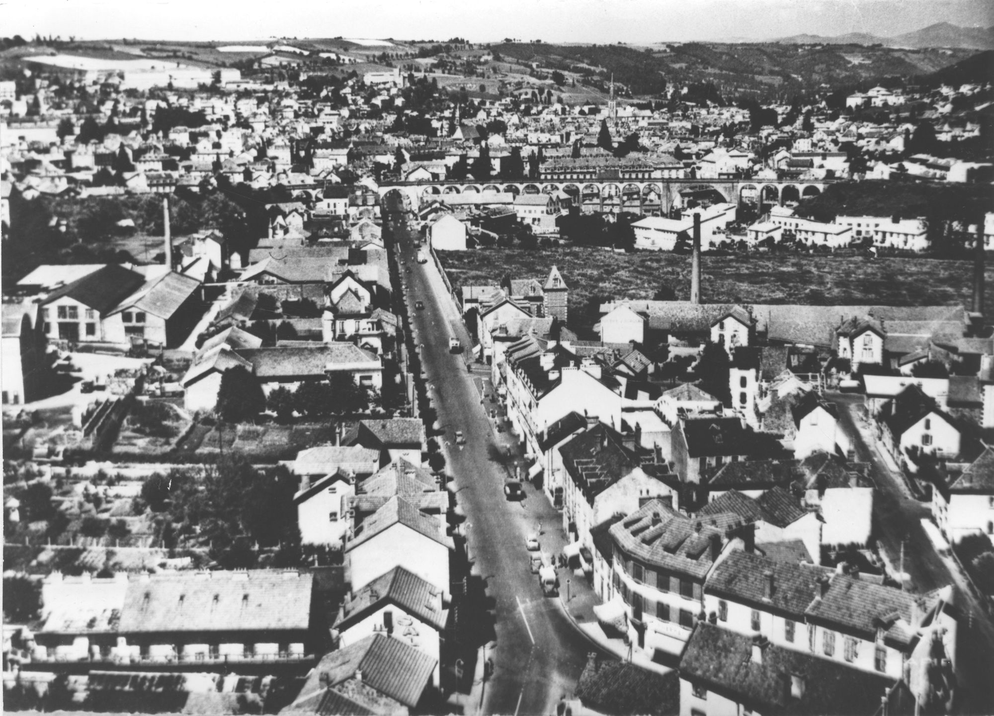 Le Square fleuri, Notre-Dame aux neiges entre voitures et Puy Courny, la Dorinière et le viaduc pris du Barra : telles sont les trois vues jugées caractéristiques de la ville à la fin des Trente glorieuses. La grande (A) et la petite Dorinière (B 1 et B 2) ont toujours leurs couleurs originales grise et blanche. Entre « les Dorinière » et la Jordanne ont été construits les bâtiments du collège de la Jordanne.