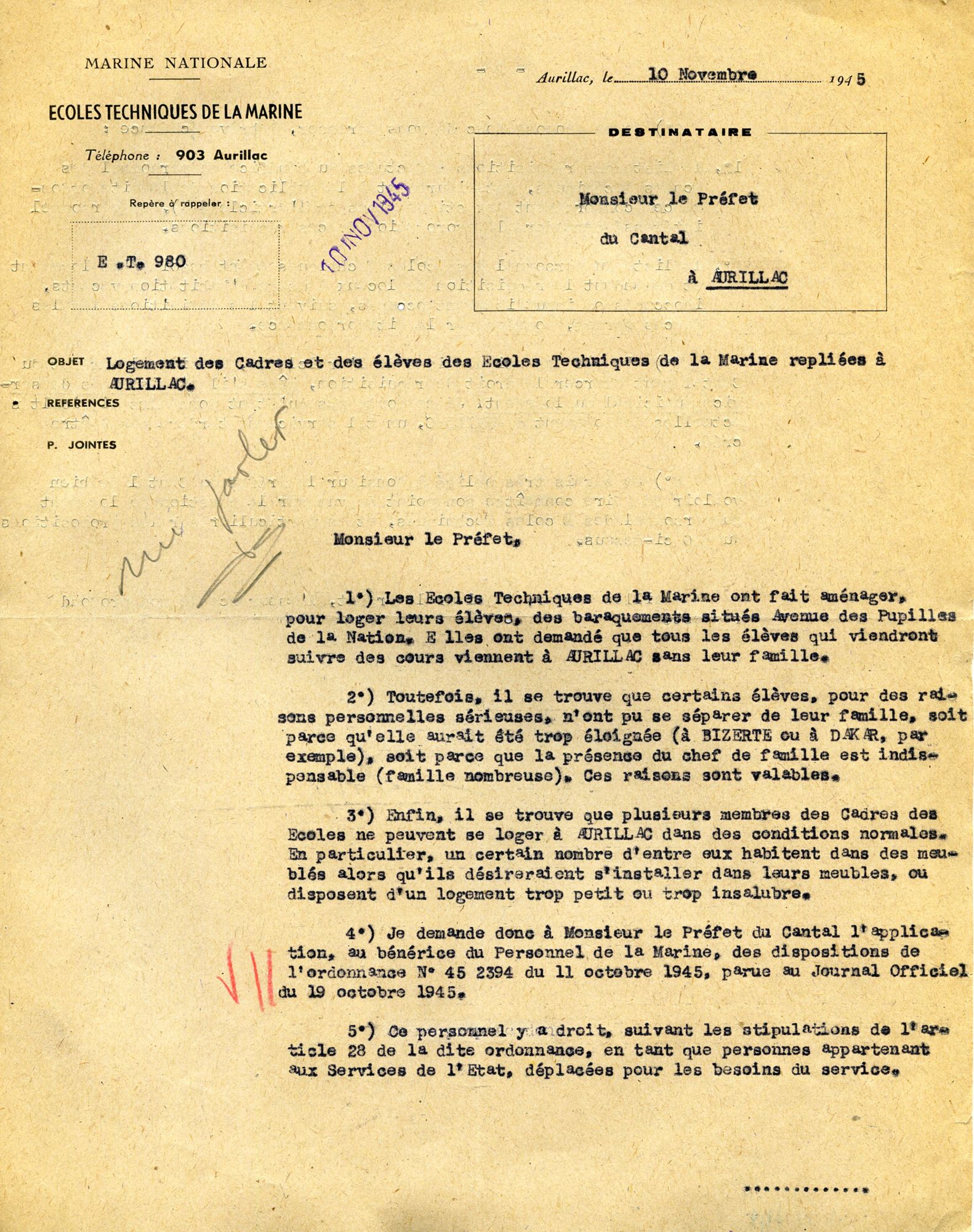 C’était la première fois, en 1943, et depuis bien longtemps, que la mer arriva à Aurillac. Les Écoles techniques de la Marine ont fait « aménager » les baraquements qui avaient accueil des réfugiés et des Juifs ; les élèves étaient priés de venir sans leur famille. Mais les élèves ayant des enfants, ainsi que l’encadrement, furent accueillis dans des logements réquisitionnés – d’ailleurs non sans mal : c’est déjà, du fait de la guerre et de l’afflux des réfugiés de toute sorte, la « crise du logement ».