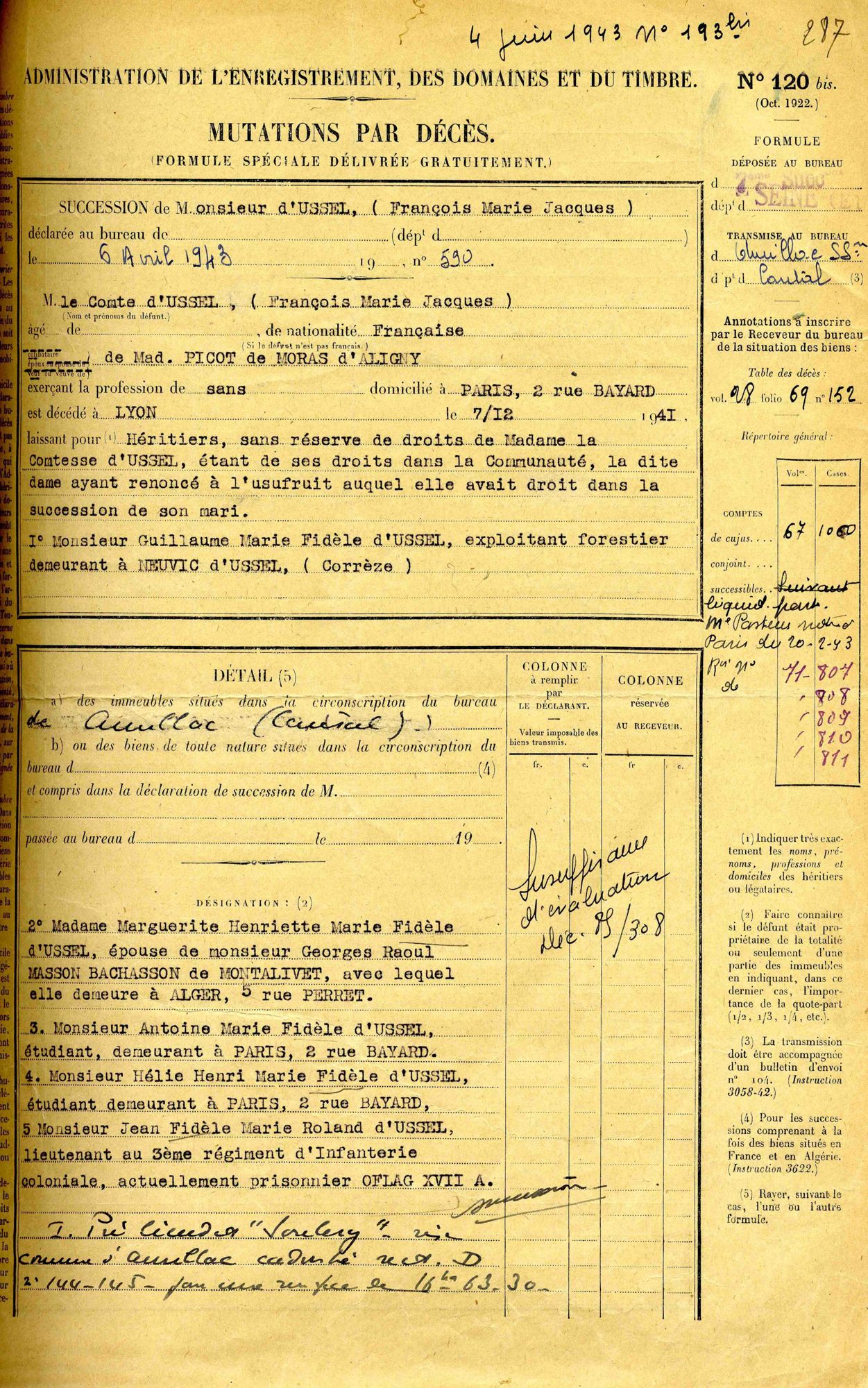 Déclaration de la succession de François, Marie, Jacques, comte d’Ussel