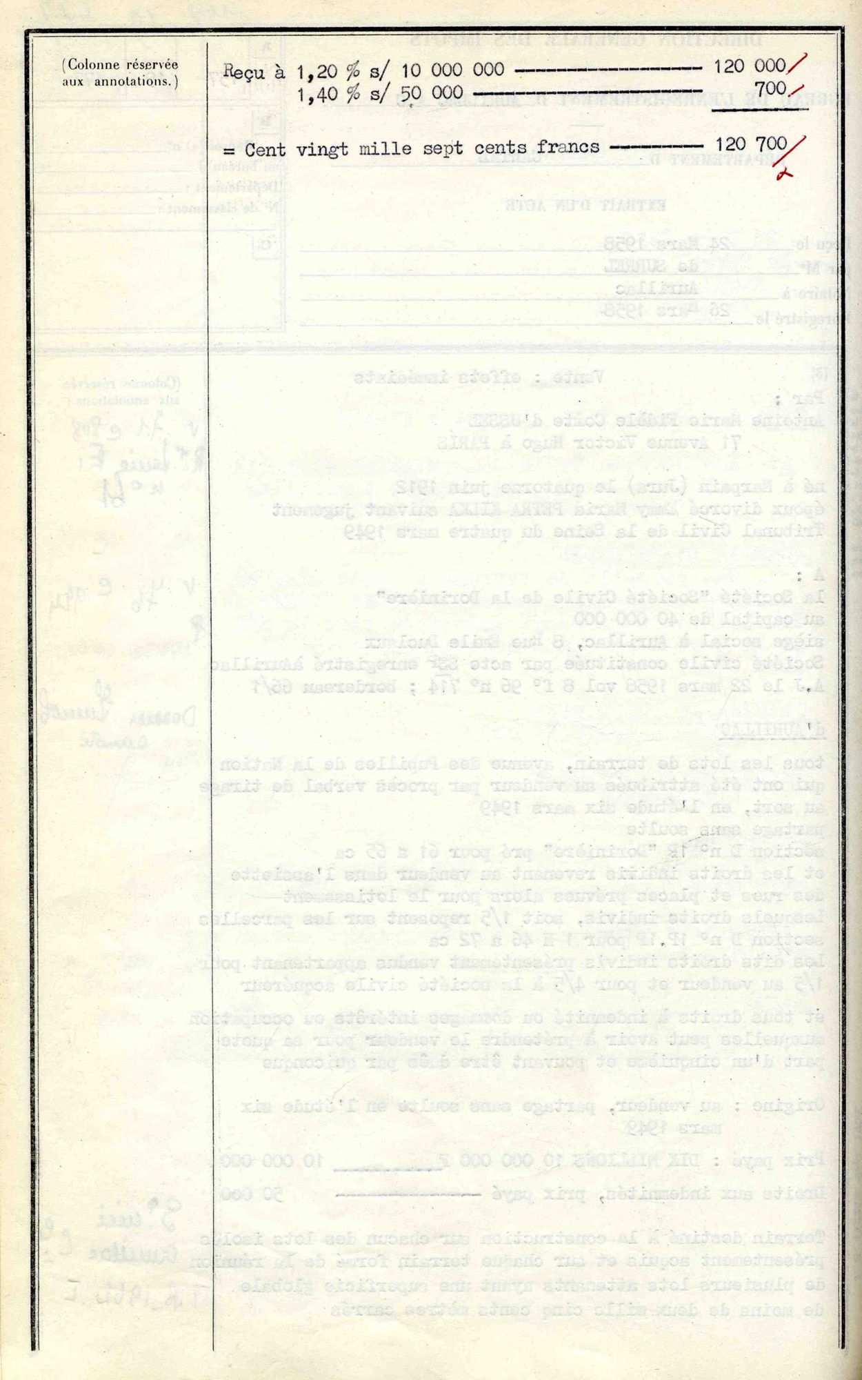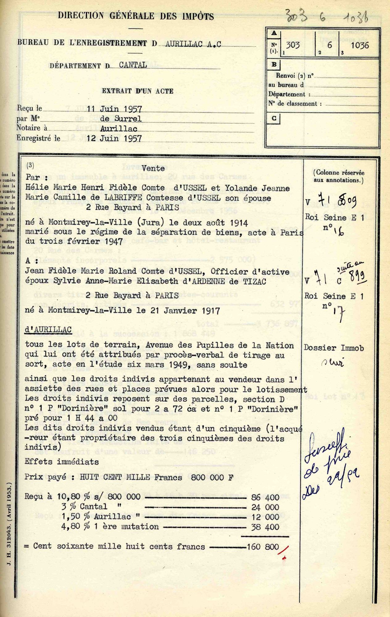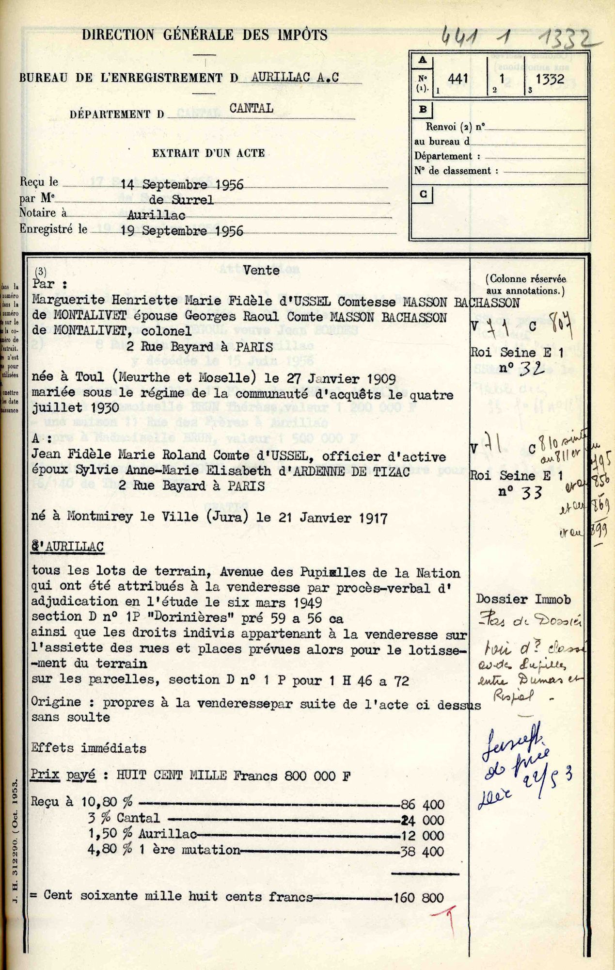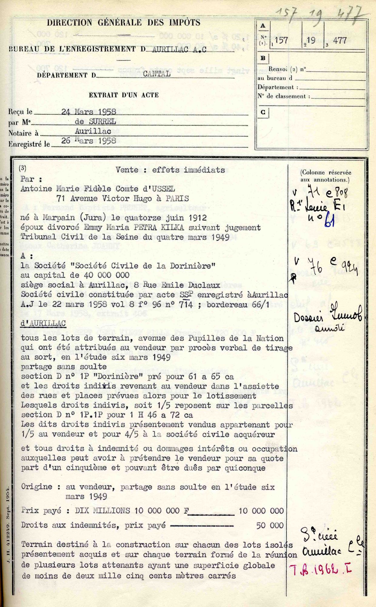 Le 6 mars 1949 avait eu lieu le partage de la succession de Jacques d’Ussel entre ses quatre enfants survivants – Guillaume étant mort en 1944. C’est dans la même étude Surrel que Jean rachète sept ans plus tard son lot d’un peu plus d’un hectare à sa sœur Marguerite, au prix de 800.000 AF.