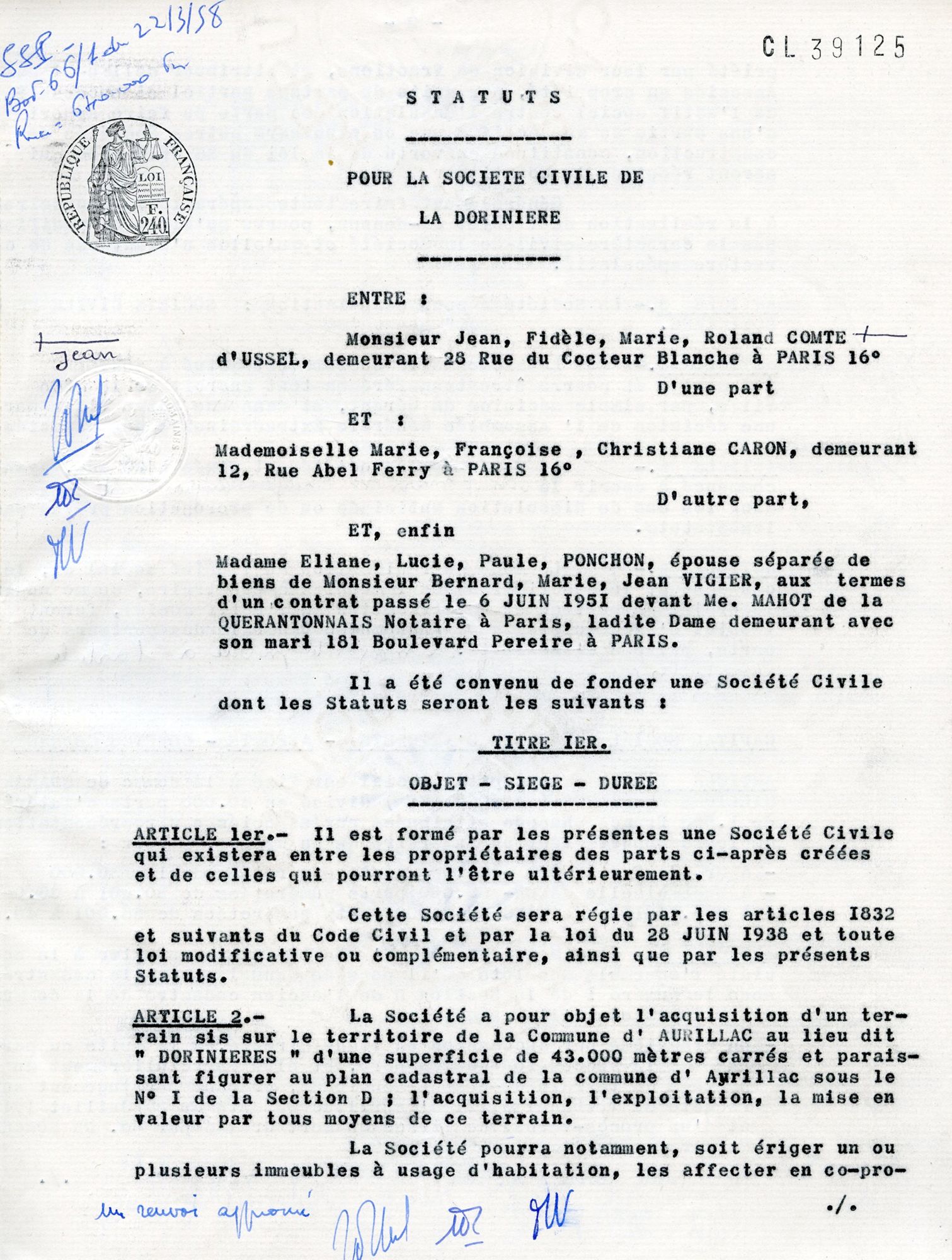 Par acte sous seing privé, Jean d’Ussel crée, avec Mademoiselle Marie Caron et Mme Vigier, née Éliane Ponchon, une SCI qui porte le nom du terrain dont il possède alors 80 %. Le but est « l’acquisition, l’exploitation, la mise en valeur par tous les moyens du terrain », notamment par l’érection « d’un ou plusieurs immeubles à usage d’habitation ». Le capital est de 40 millions d’anciens francs ; Jean d’Ussel apporte, avec les 80 % du terrain, 30.000 parts de 1.000 francs. Ses associées apportent chacune 5 millions de francs en numéraire.