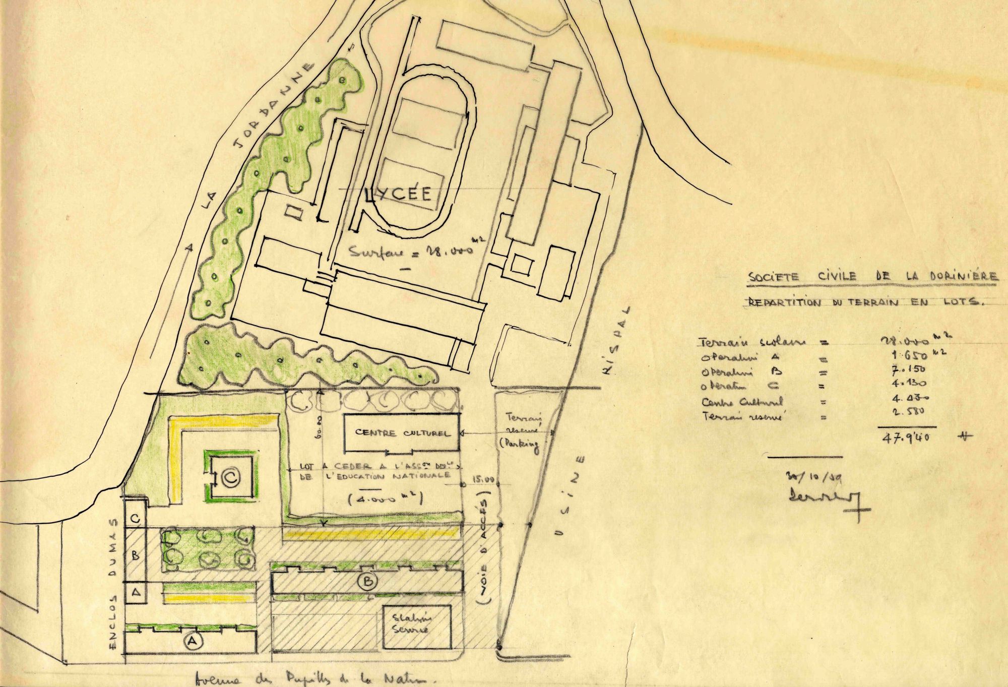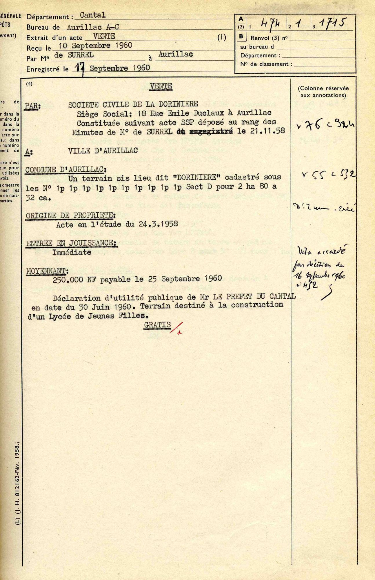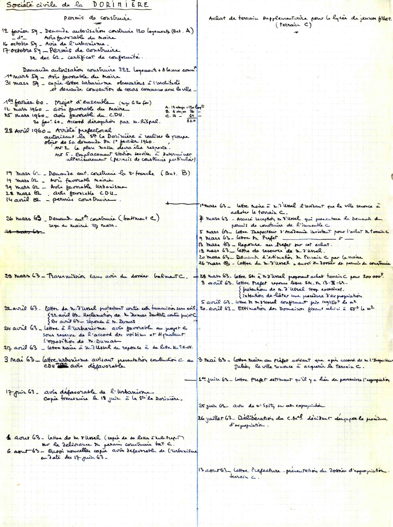 Le 30 juin 1960 avait déclaré d’utilité publique l’acquisition d’un terrain « destiné à la construction d’un logement de jeunes filles » de 28.032 m². La SCI cède cette parcelle à la ville pour 250.000 NF (soit 25 millions d’AF).