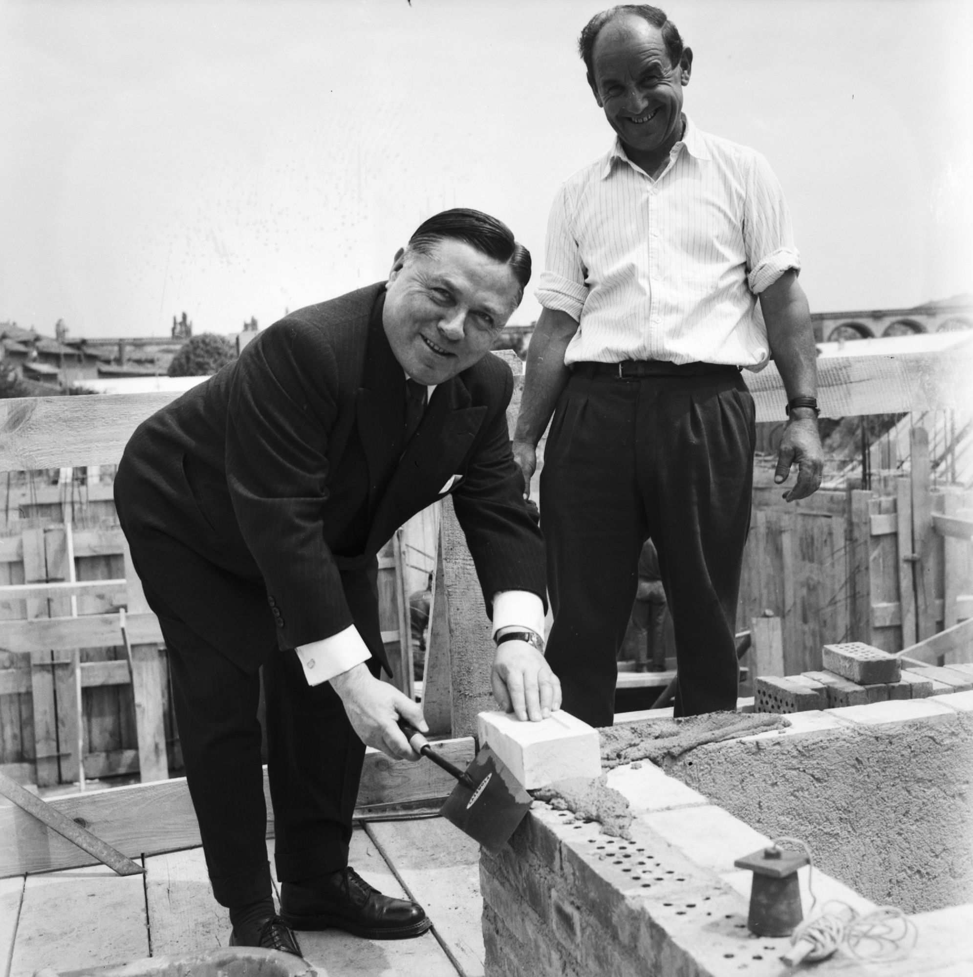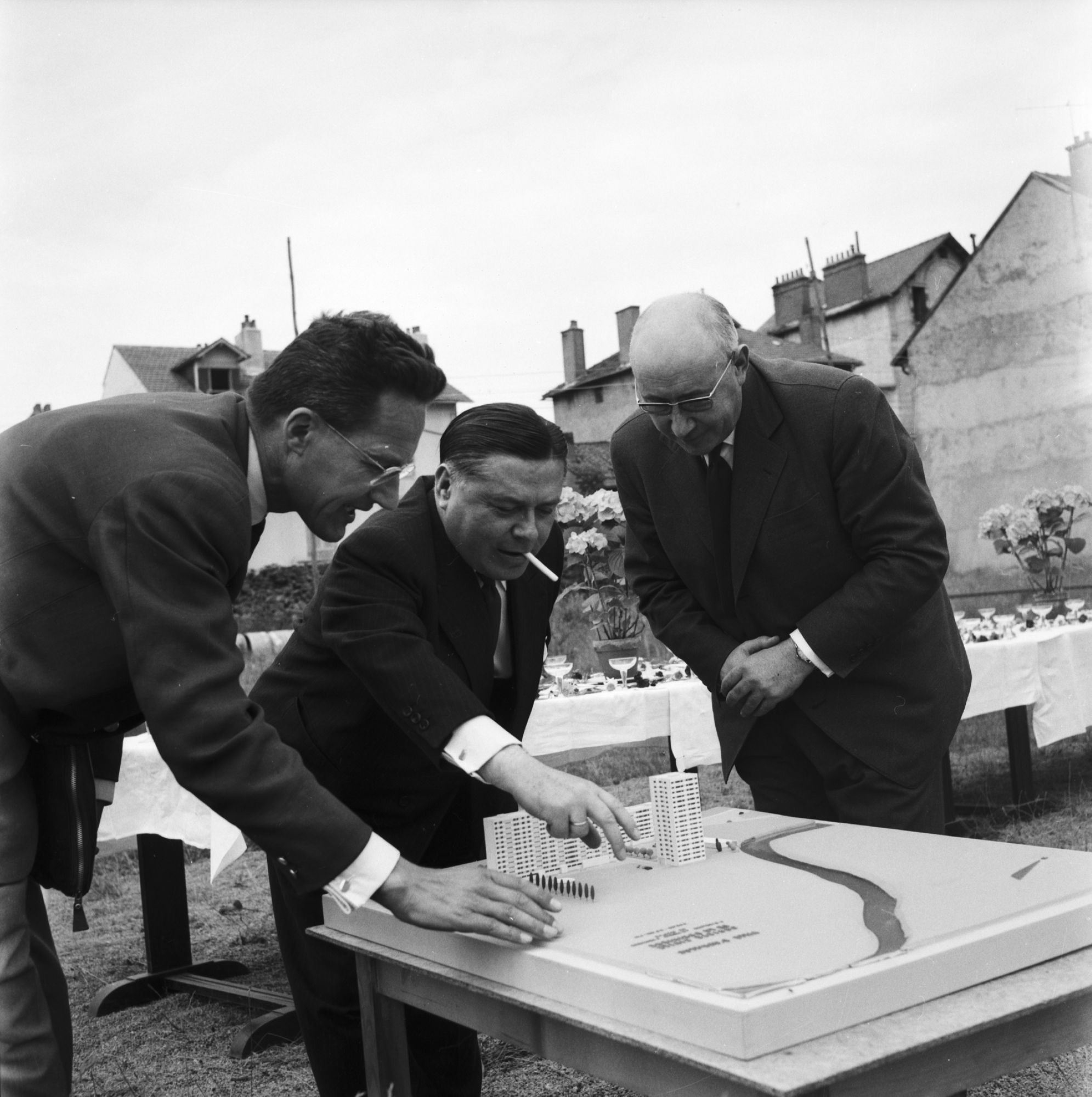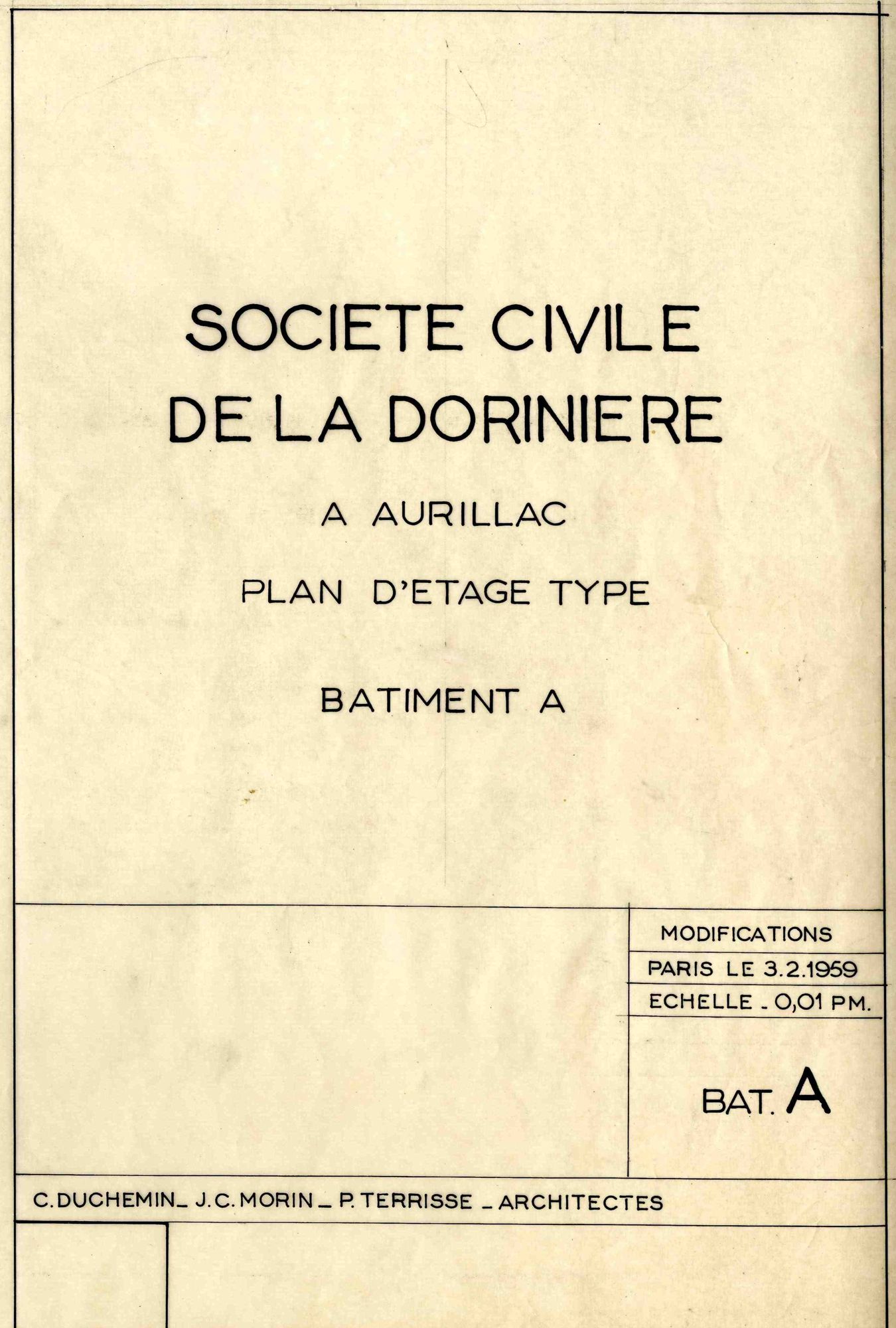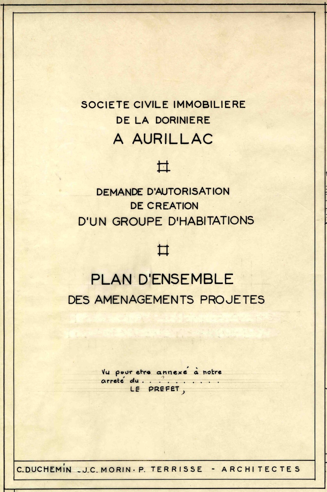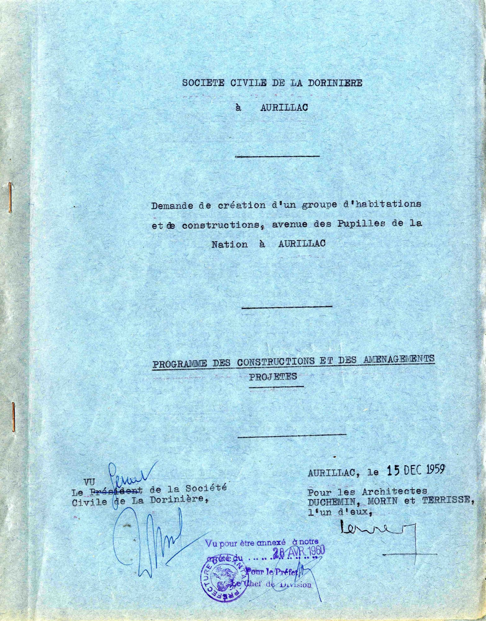 Le « comte Jean d’Ussel », gérant de la SCI, le préfet Guy Malines et l’architecte Pierre Terrisse († 17 août 1961) examinent la maquette des trois bâtiments. Jean d’Ussel remercie le préfet pour son aide, le sénateur-maire Piales, le Crédit foncier, maître de Surrel son notaire et les architectes. Le préfet Malines indique à Jean d’Ussel que son projet, « d’autant plus nécessaire que la ville est en pleine expansion », est « conforme à l’intérêt général ». Et l’auteur de l’article (G. D.) de conclure : « Donc de nouveaux immeubles vont encore s’édifier à Aurillac. On construit partout. Dans le cœur de la ville on détruit même pour construire. Partout, d’immenses grues dressent dans le ciel leur silhouette métallique. On finira tout de même par la juguler, cette fameuse crise du logement ».
