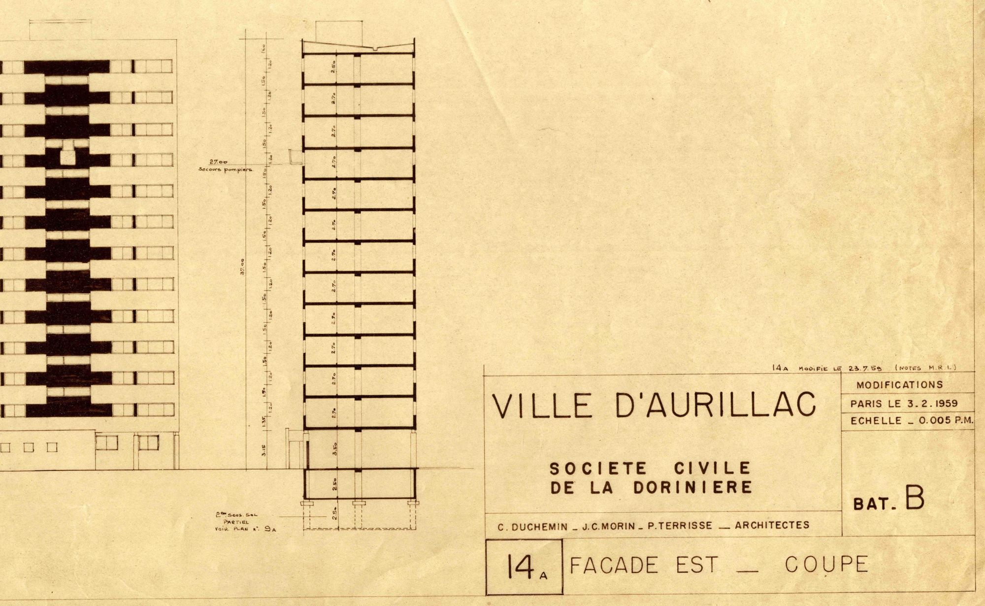 Les architectes C. Duchemin, J.-C. Morin et P. Terrisse (architecte aurillacois dont les plans ont été déposés aux Archives départementales par le cabinet Estival, auquel dont fils Charles fut l’associé) ont prévu douze étages avec 2,70 m sous plafond (2,50 au dernier étage), ce qui fait quinze niveaux en tout (avec un rez-de-chaussée de 3,50 m sous plafond et deux sous-sols). L’ensemble fait 37 m de haut, et c’est toujours l’immeuble d’habitation le plus haut du Cantal.