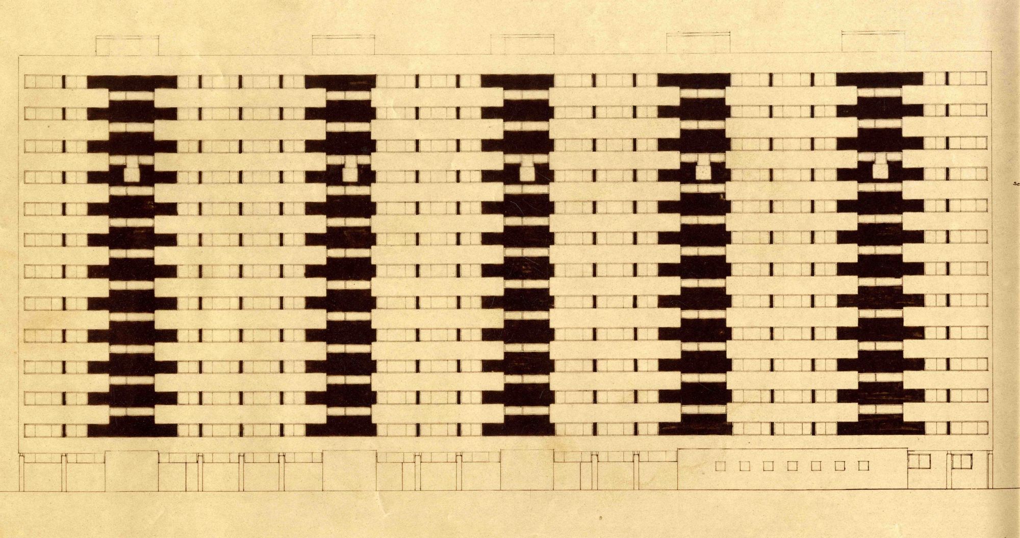 Le bâtiment B prévu initialement était unique : parallèle à l’avenue (et au bâtiment A), il aurait dû contenir 36 logements dans 6 étages et mesurer plus de 55 mètres de long.