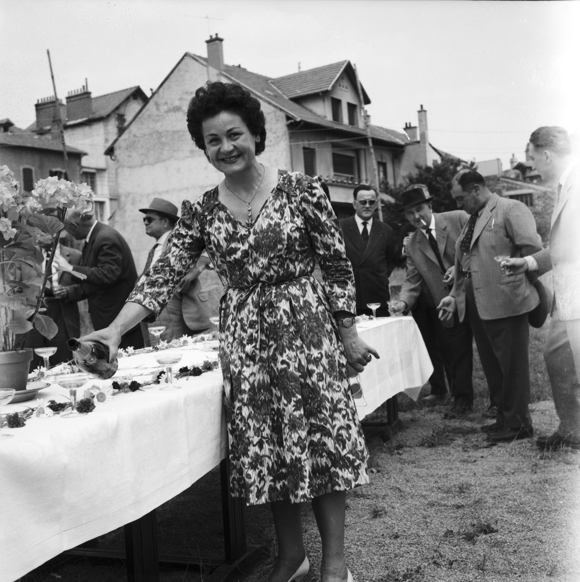 Sur la prairie a été posé un buffet arrosé de champagne servi par une dame souriante portant le saint-esprit auvergnat, et derrière laquelle se détachent les maisons de l’avenue des Pupilles.