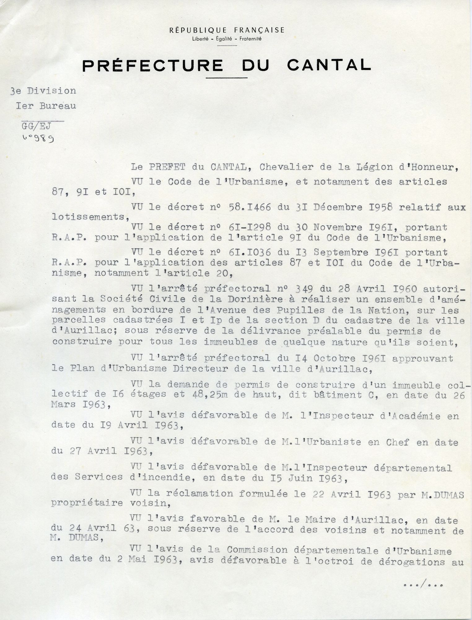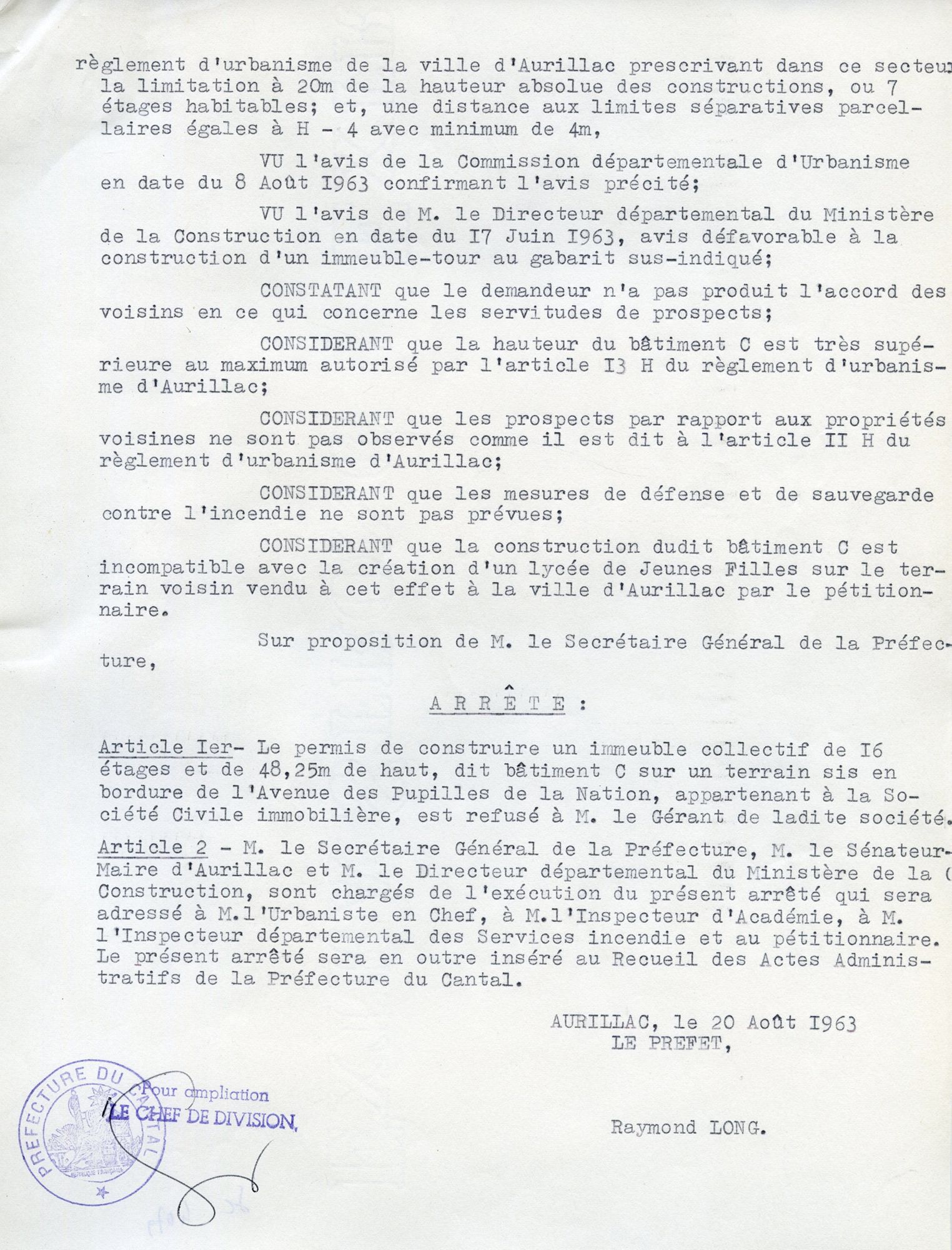 Arrêté du préfet du Cantal refusant le permis de construire du bâtiment C