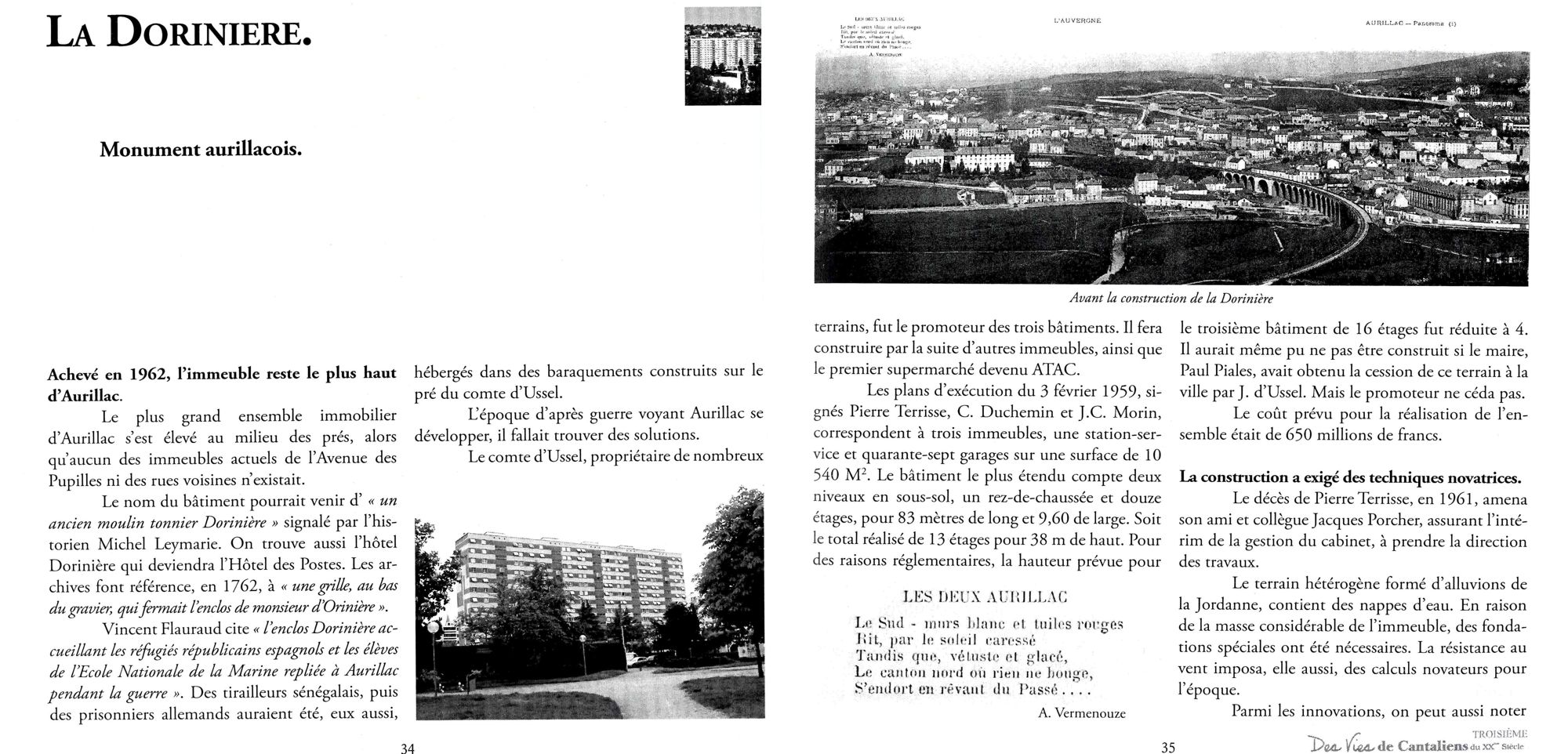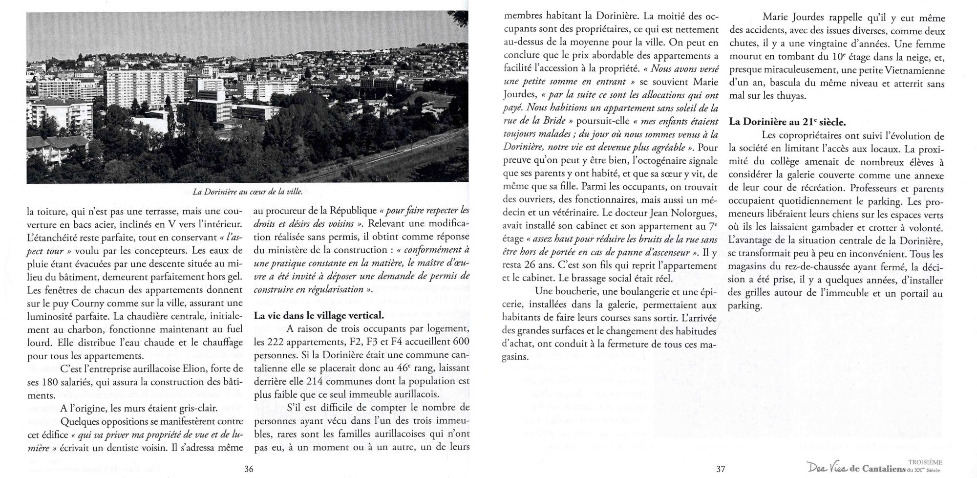 Jean-Claude Champeil, dans son 3e tome des Vies de Cantaliens du XXe siècle, consacre en 2008 plusieurs pages à la Dorinière, présentée comme un « monument aurillacois ». Comme le fera la Montagne en février 2012, il recueille le témoignage d’habitants et décrit l’évolution de cette barre de copropriétaires jusqu’au début du XXIe siècle.