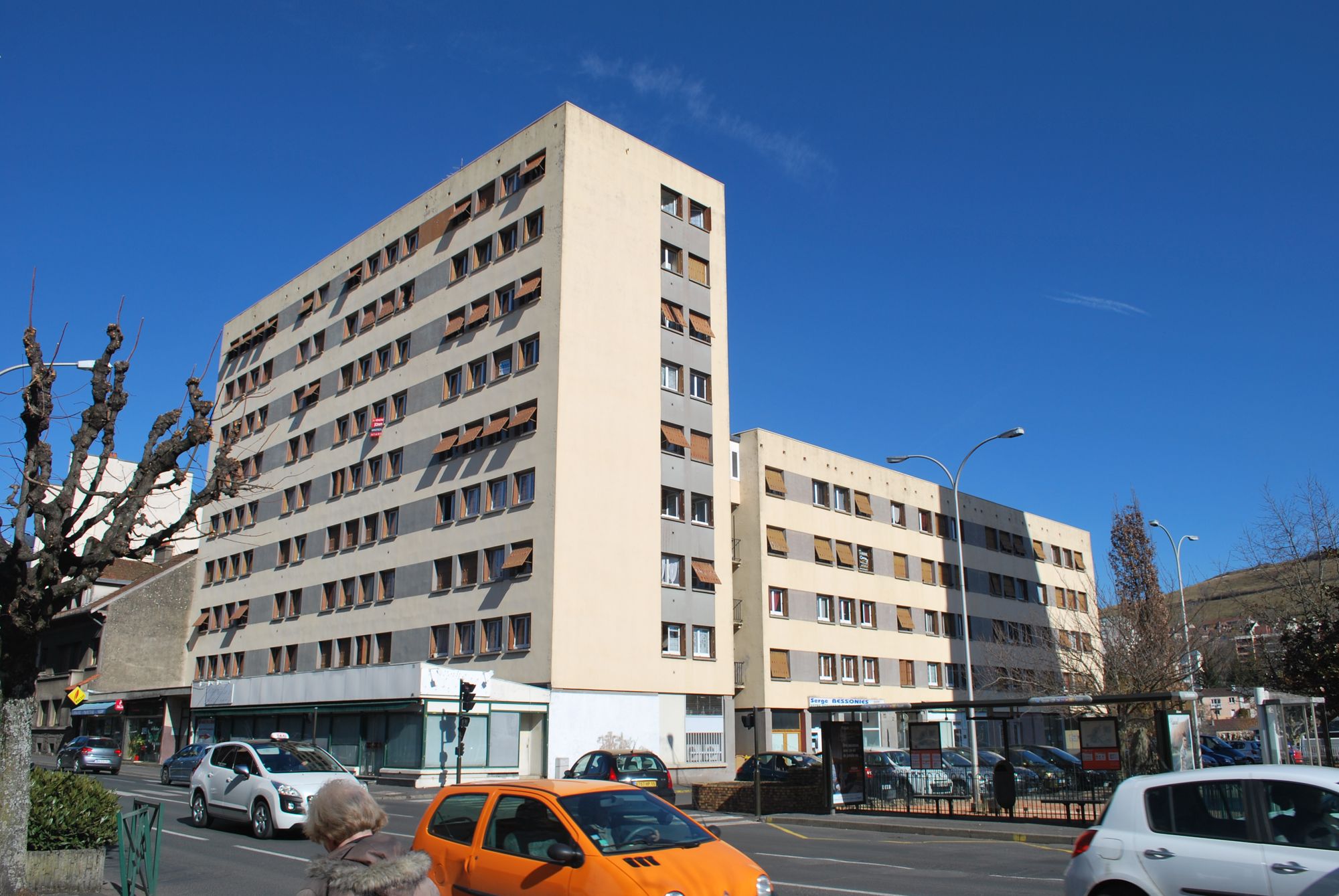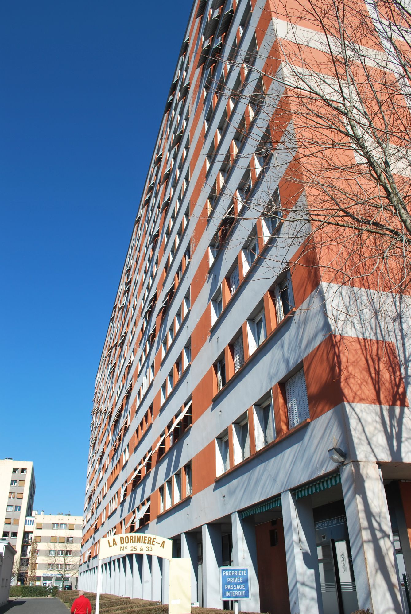 Lampadaire, muret, abri de bus, barrière, panneau de signalisation, feu forment l’essentiel de la « verdure » où s’élève la barre. À gauche et à droite, on entrevoit le puy Courny et la maison Rispal, qui seules rappellent que la Dorinière fut un morceau de campagne dans une banlieue industrielle devenue un quartier de la ville.