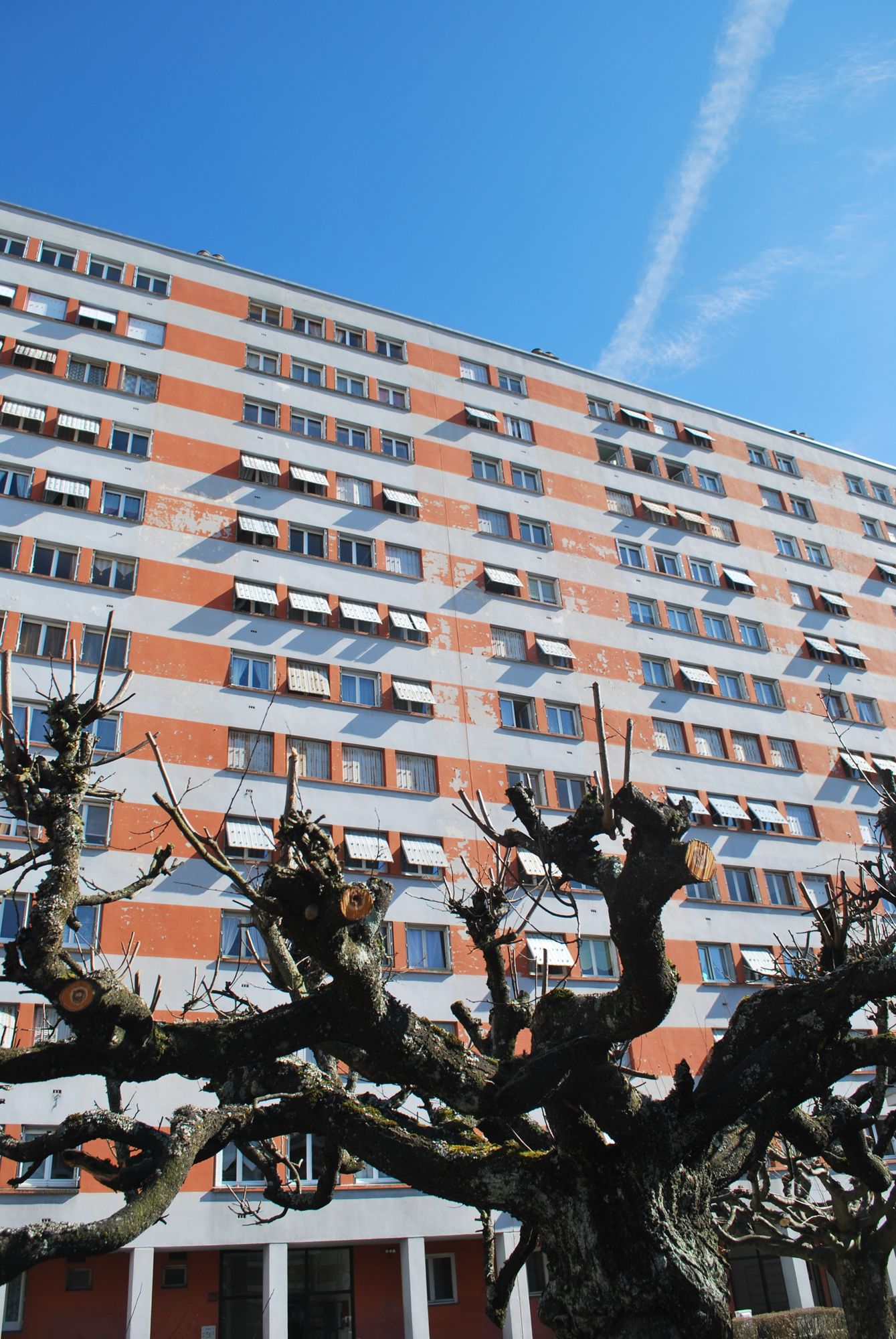 Ce faisant, c’est une architecture non seulement non vernaculaire qui s’est imposée (celle de la deuxième moitié du XIXe, déjà, ne l’était plus), mais aussi en rupture avec les formes traditionnelles de l’habitat : le toit, à pente unique ou à deux versants, encore présent aux Camisières, à la Remonte, ou dans les ensembles du Foyer cantalien, disparaît dans les constructions proches des avenues des Pupilles et des Volontaires, celui de La Dorinière innovant même avec un système de pentes inversées – non visibles, en tout cas, de l’extérieur. Loin de susciter une réprobation d’essence paysagère – les critiques à l’égard de La Dorinière, sur le moment, portent davantage sur son gigantisme, mettant en doute sa solidité, que sur son esthétique – ces formes nouvelles semblent fonctionner auprès des contemporains comme des marqueurs d’urbanité et d’entrée en modernité, perçus positivement. Les cartes postales, destinées à porter au loin l’image d’Aurillac, ne lésinent pas sur les vues générales de la ville nouvelle, avec ses grandes masses blanches. En cela, la confection d’un nouvel enduit, orange et gris, en 1983, a signé l’amorce d’une modification des regards : il était là pour habiller, individualiser, intégrer, comme cela avait commencé à se pratiquer pour de grands bâtiments tant commerciaux ou industriels que d’habitat à compter de la fin des années 1970. L’ampleur de l’édifice, certes, fait qu’ici cette quête d’intégration se transforme en étendard. Mais la dépréciation de la grande barre est bien signifiée, en une époque où les constructions pavillonnaires avaient de nouveau pris le pas, gagnant de plus en plus l’espace périurbain.
