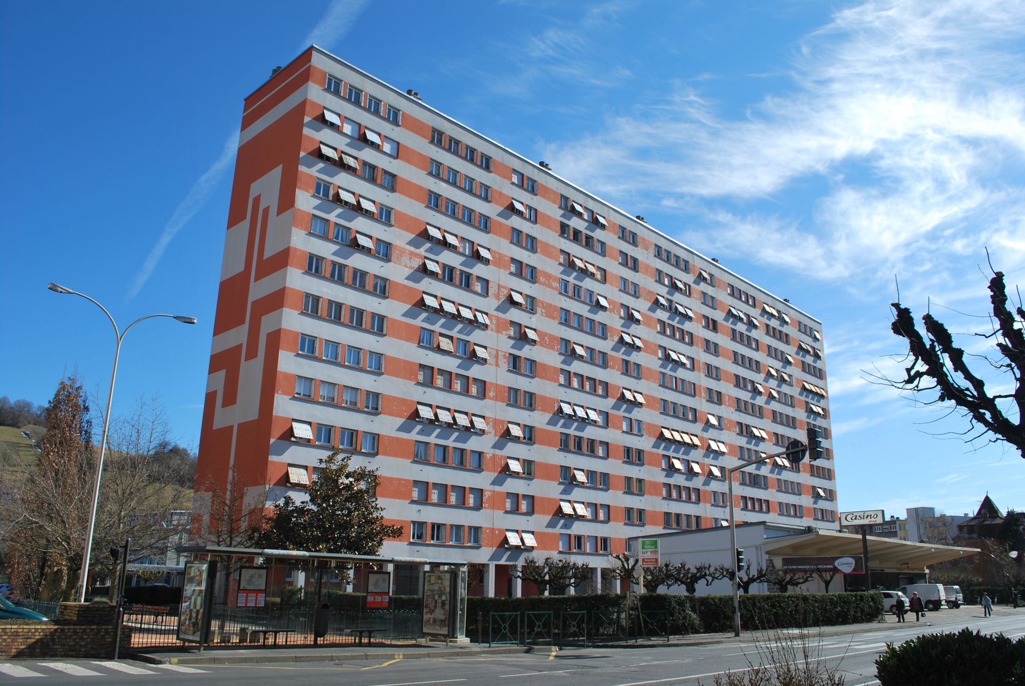 La barre blanche et grise est désormais orange ; la peinture est fraîche et point encore écaillée. Cette couleur, plutôt typique des seventies, a été reprise, au début du XXIe siècle, pour la façade de l’hôtel de ville et celle de l’hôpital.