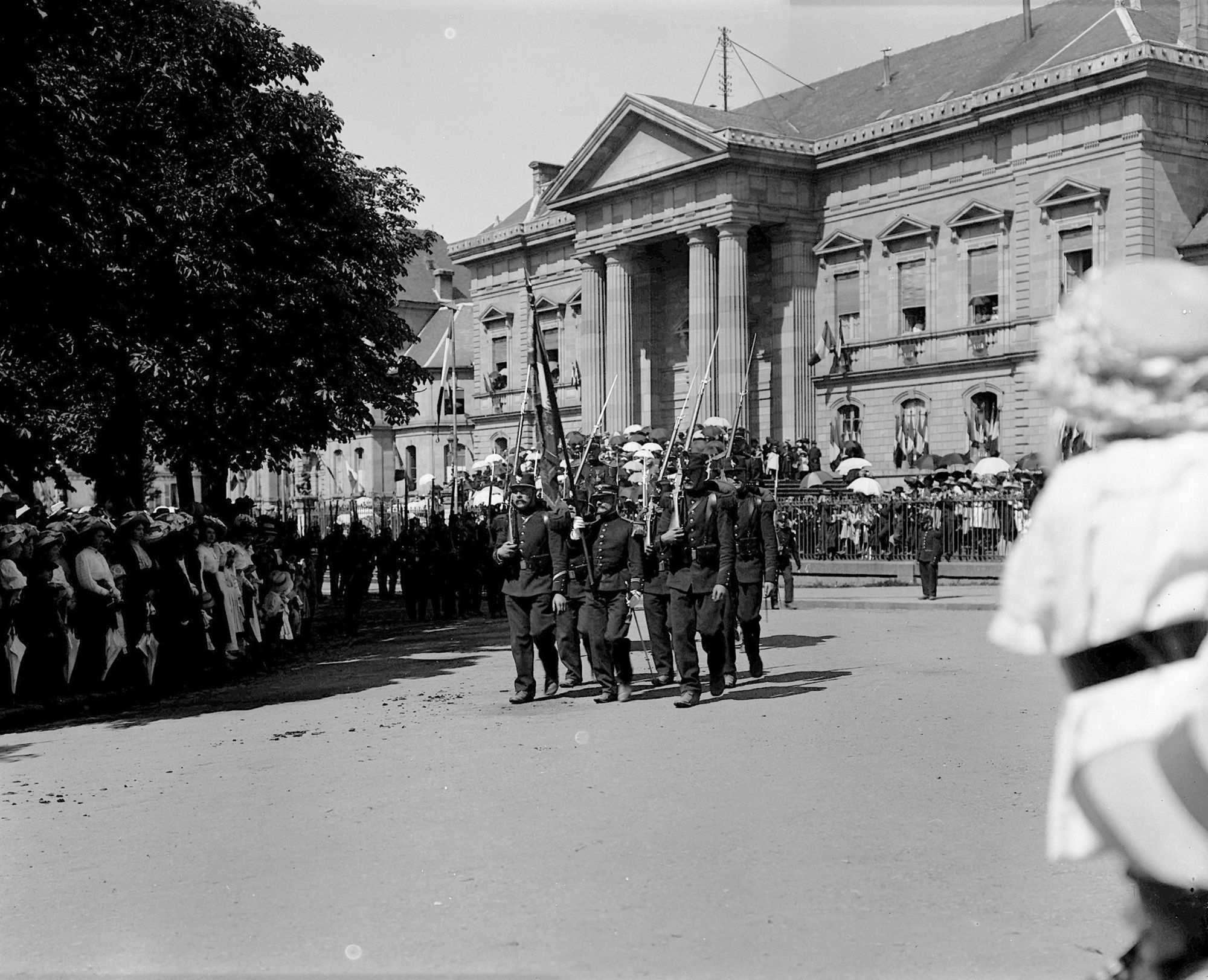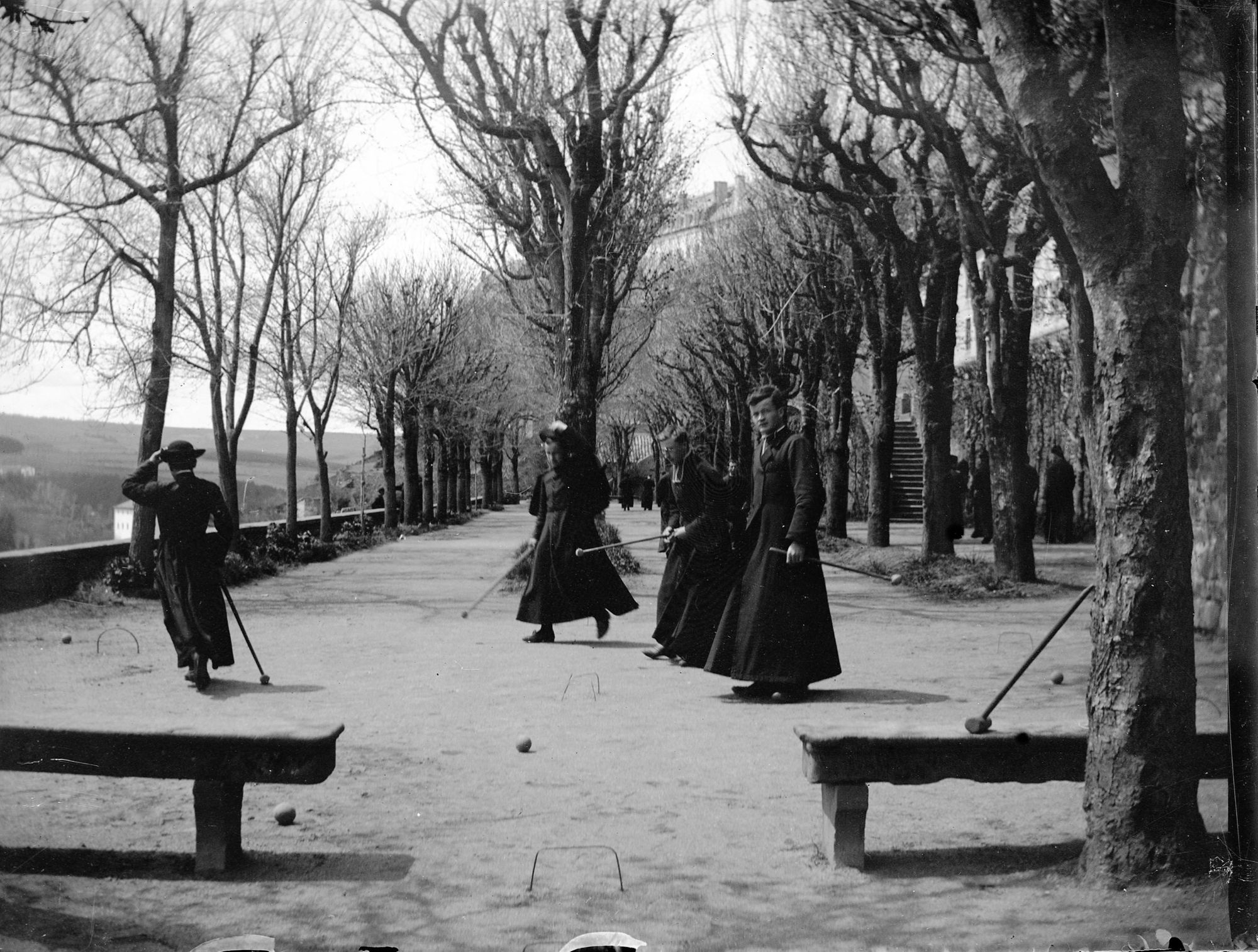 Une femme en habits bourgeois marche, dos au photographe. La composition de ce cliché dénote une volonté du photographe de sortir des habituels portraits et scènes collectives où chacun pose de face.