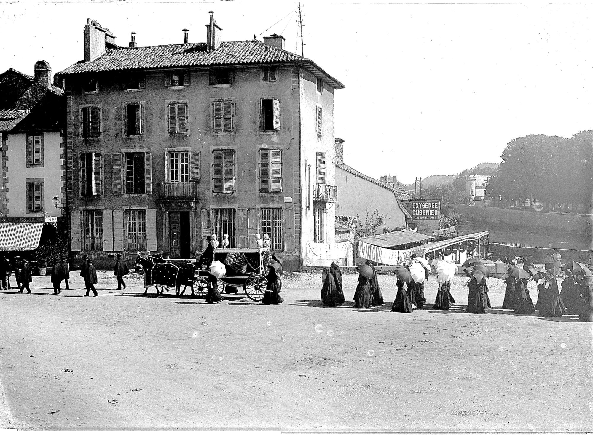 Le corbillard, tiré par deux chevaux caparaçonnés, est précédé des hommes et suivi des femmes. Il pourrait s’agir des obsèques du député Adrien Bastid, le 8 avril 1903.