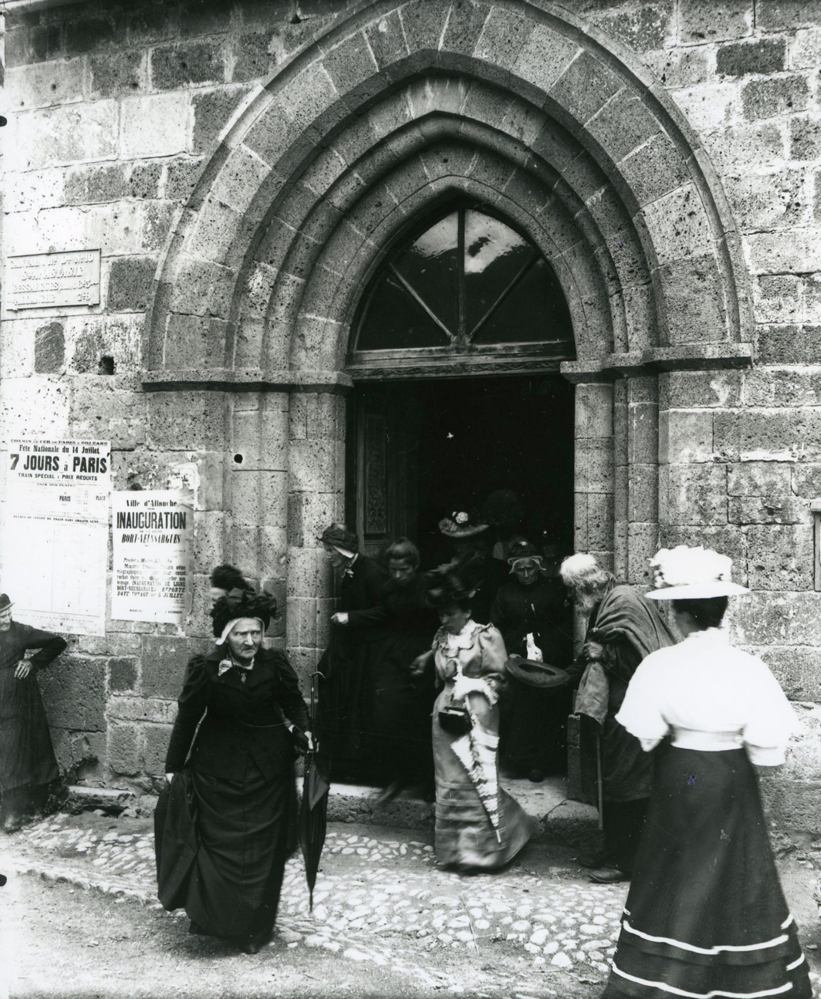 Bien en vue près de la porte, une affiche annonce l’inauguration de la ligne Bort-Neussargues le 5 juillet 1908 à Allanche.