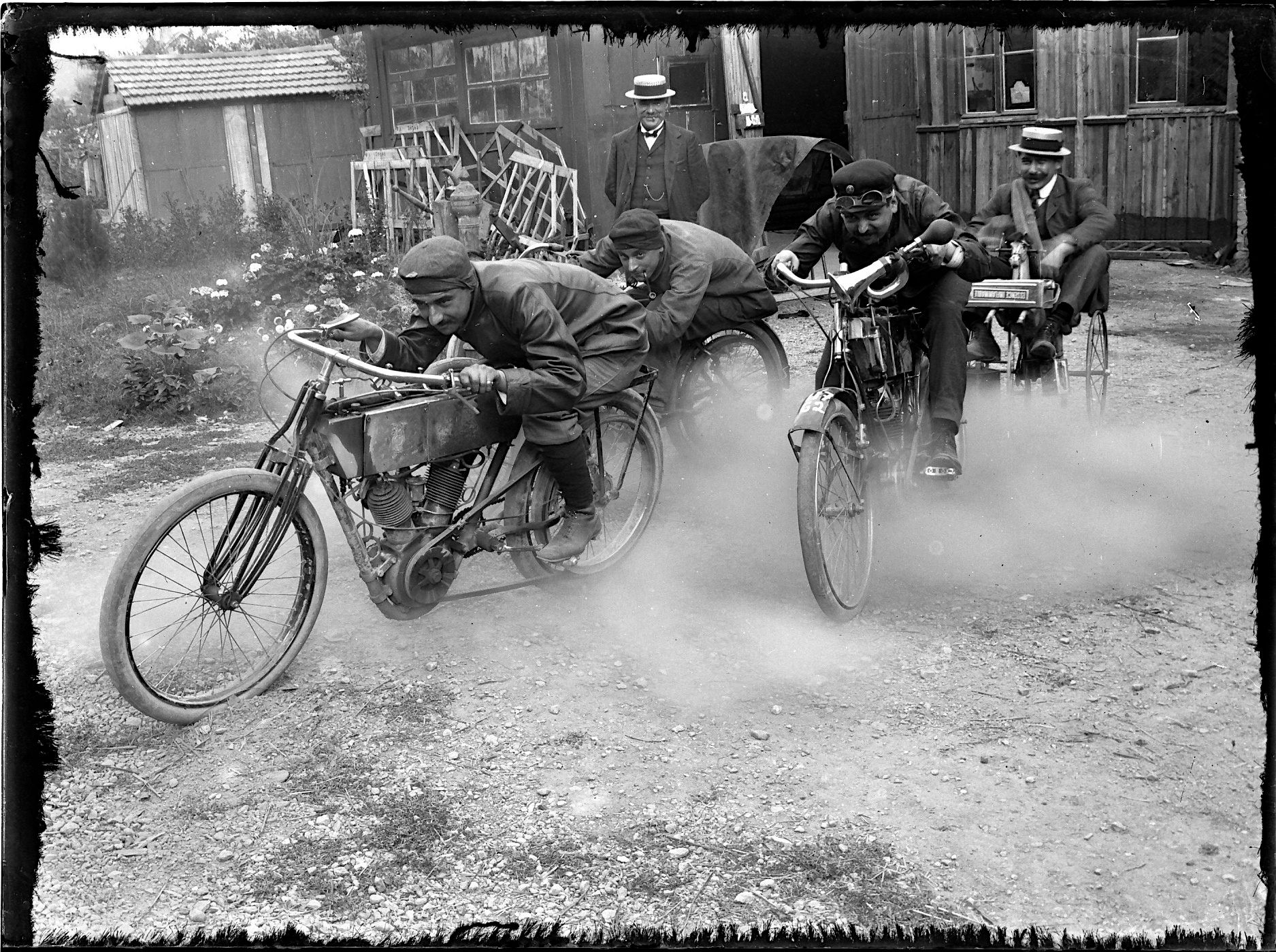 Si l’impression de mouvement est bien là, les « motards » sont en réalité immobiles : seule la roue arrière de la moto de droite tourne pour soulever le nuage de poussière. Le dernier véhicule est un peu à part : il s’agit en réalité d’un simple cheval de bois monté sur roues.