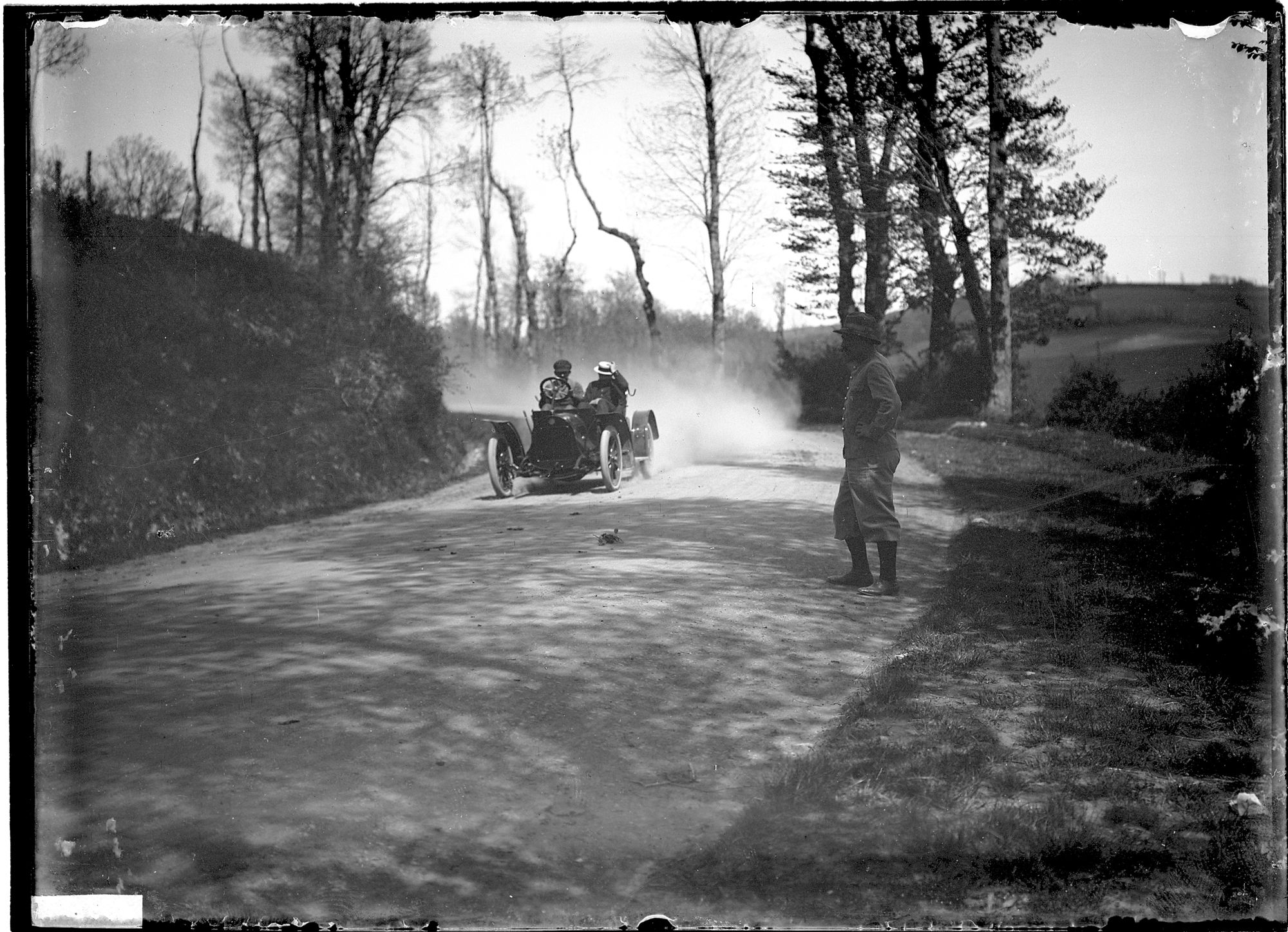 Cette photographie a peut-être été prise lors de la coupe Gordon-Benett dans le Puy-de-Dôme en 1905. Cela expliquerait la présence de l’homme à droite, en tant que commissaire de course.