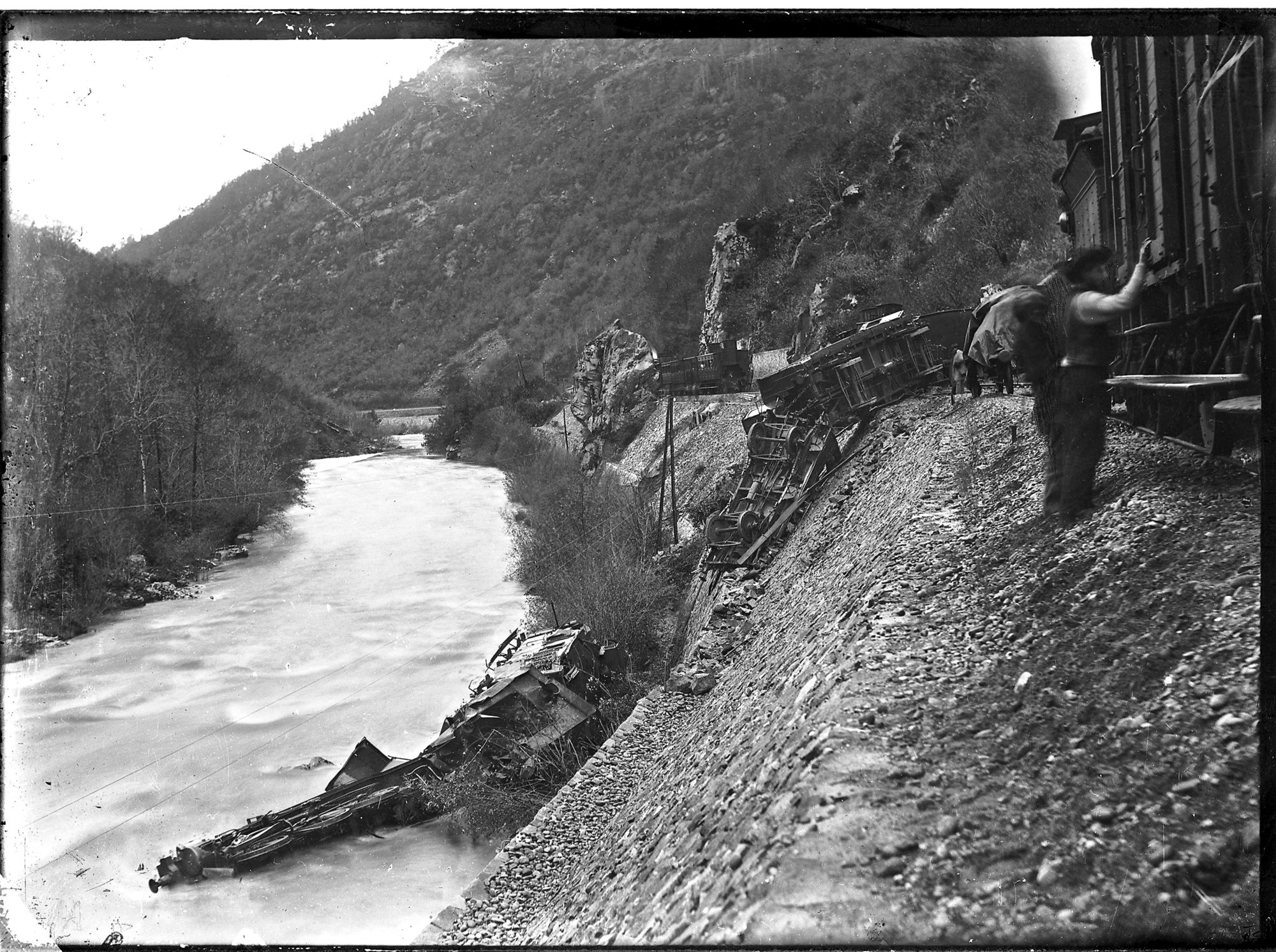 Le déraillement spectaculaire de ce train est dû à un éboulement soudain sur les voies. Deux morts furent à déplorer : le mécanicien et le conducteur.