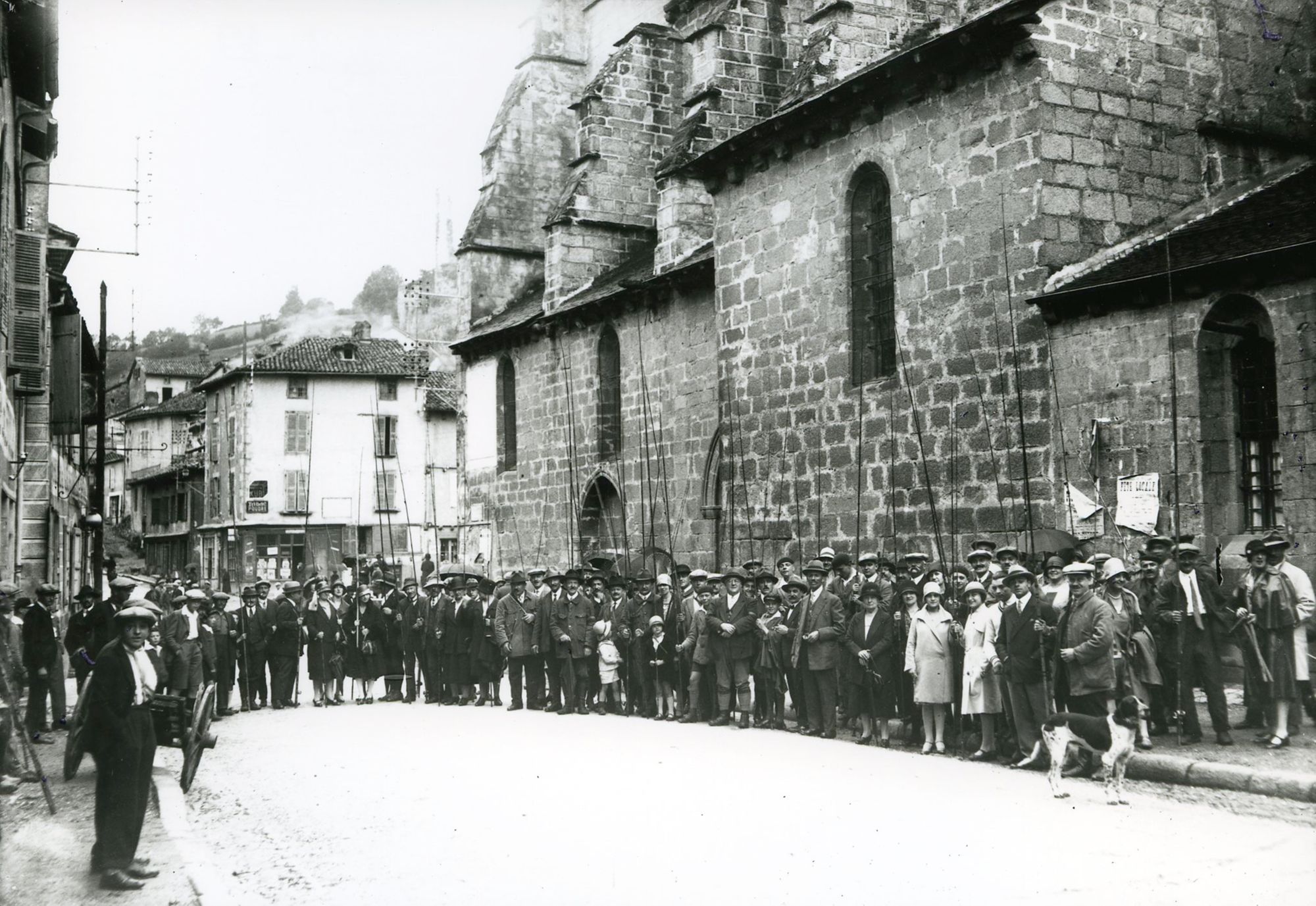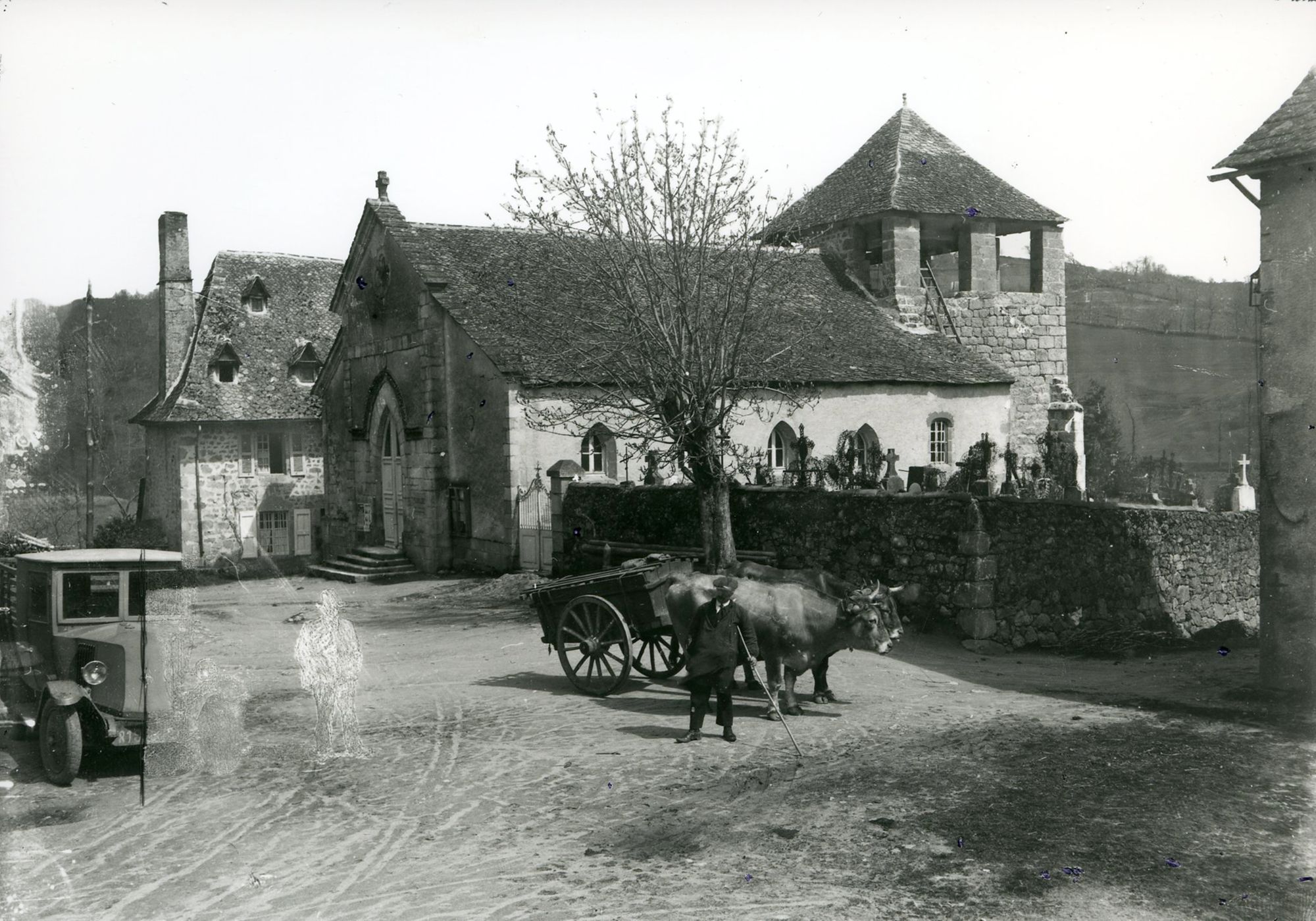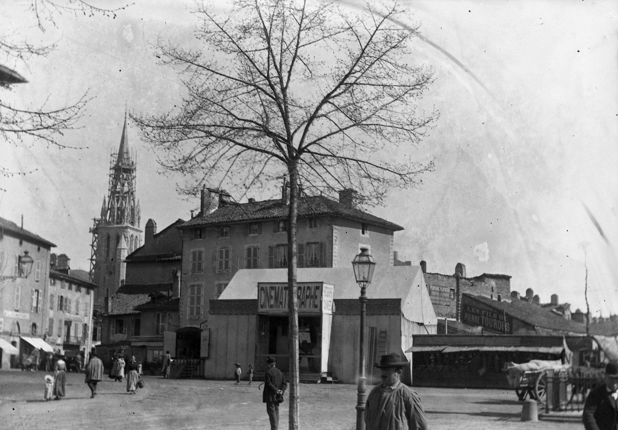 A l’arrière-plan, on aperçoit le clocher de l’église Saint-Géraud en cours de construction.