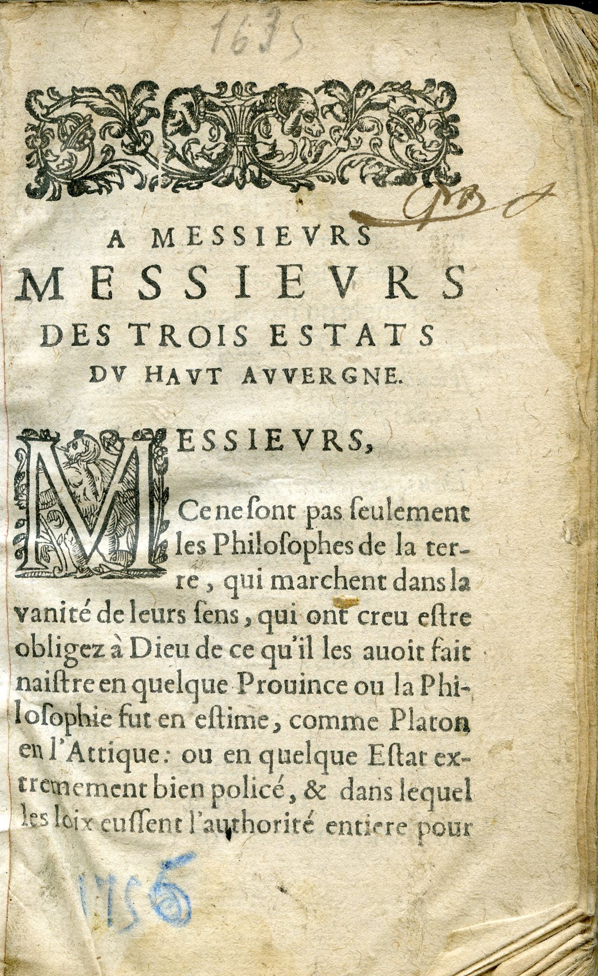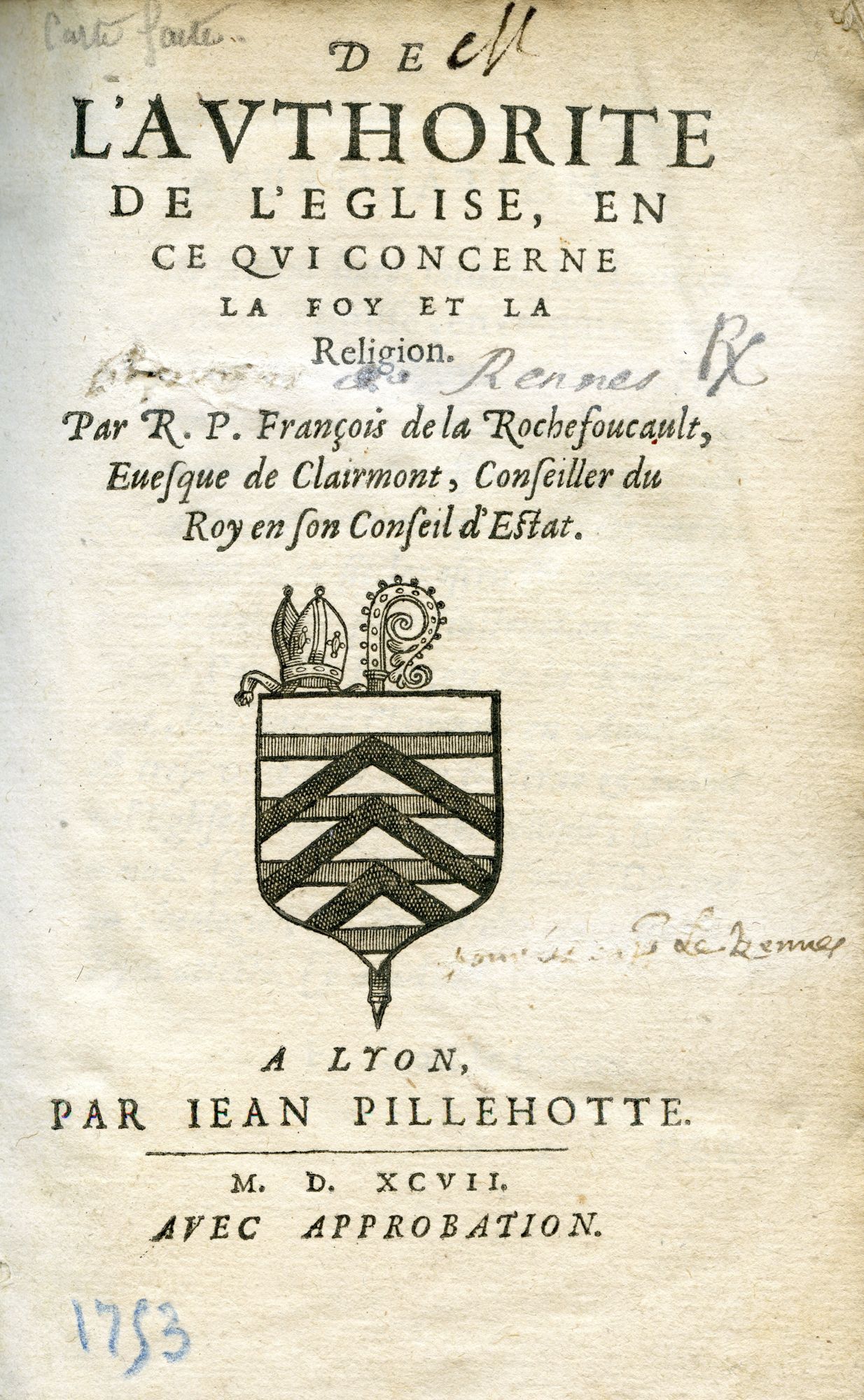 A BIB 1753, De l'Authorité de l'Eglise, en ce qui concerne la foy et la religion..., par R.-P. François de la Rochefoucault, evesque de Clairmont, conseiller du roy en son conseil d'Estat, Lyon, Jean Pillehotte, 1597.