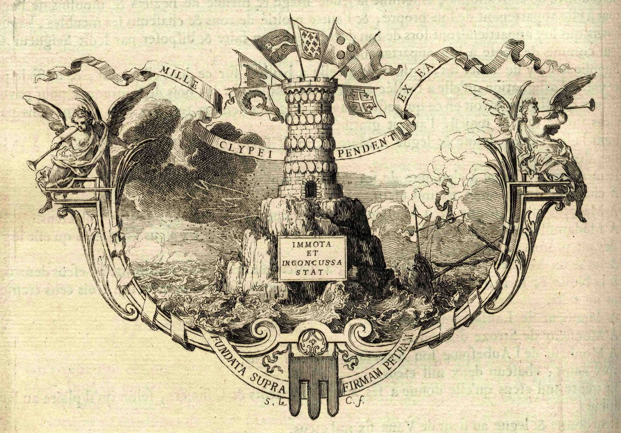 L’une des vignettes du tome II met en scène le meuble héraldique parlant des la Tour d’Auvergne : une tour. Cette tour inexpugnable et bâtie sur le roc, insensible aux éléments, ornée de mille trophées et de prestigieuses bannières, représente la maison de la Tour d’Auvergne dans sa puissance et sa gloire.