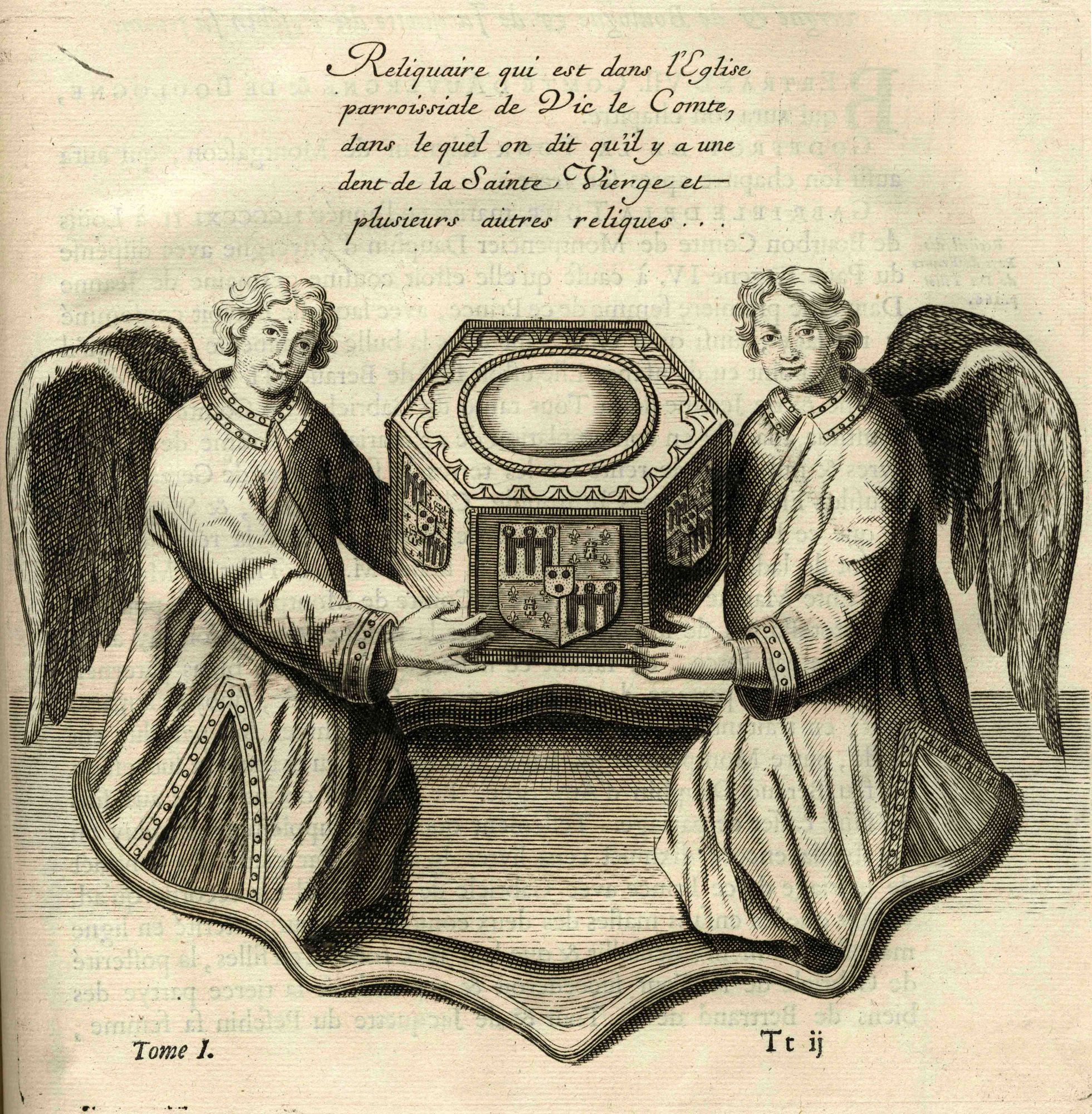 Bertrand V [nommé VI par Baluze] de la Tour, comte d’Auvergne († 1461), donna au XVe siècle à l’église de Vic-le-Comte un reliquaire d’une dent de la Vierge ; la boîte est tenue par deux anges ; elle porte les armes écartelées, au 1 et 4, comté d’Auvergne ; aux 2 et 3, La Tour ; brochant sur le tout, Boulogne.