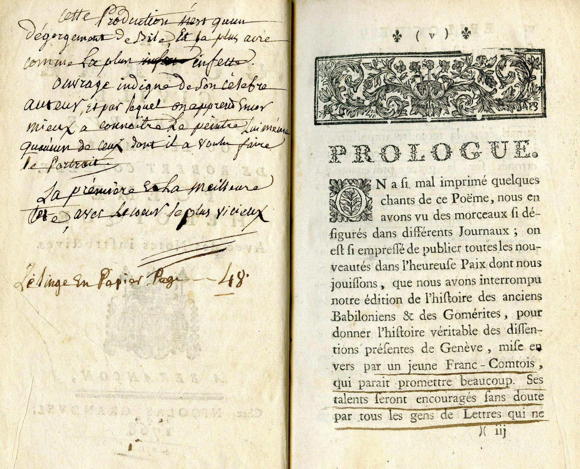 A BIB 1684, La guerre civile de Genève, ou les amours de Robert Covelle. Poème héroïque avec des notes instructives, Besançon, Nicolas Grandvel, 1768 (avec des annotations des années 1820).