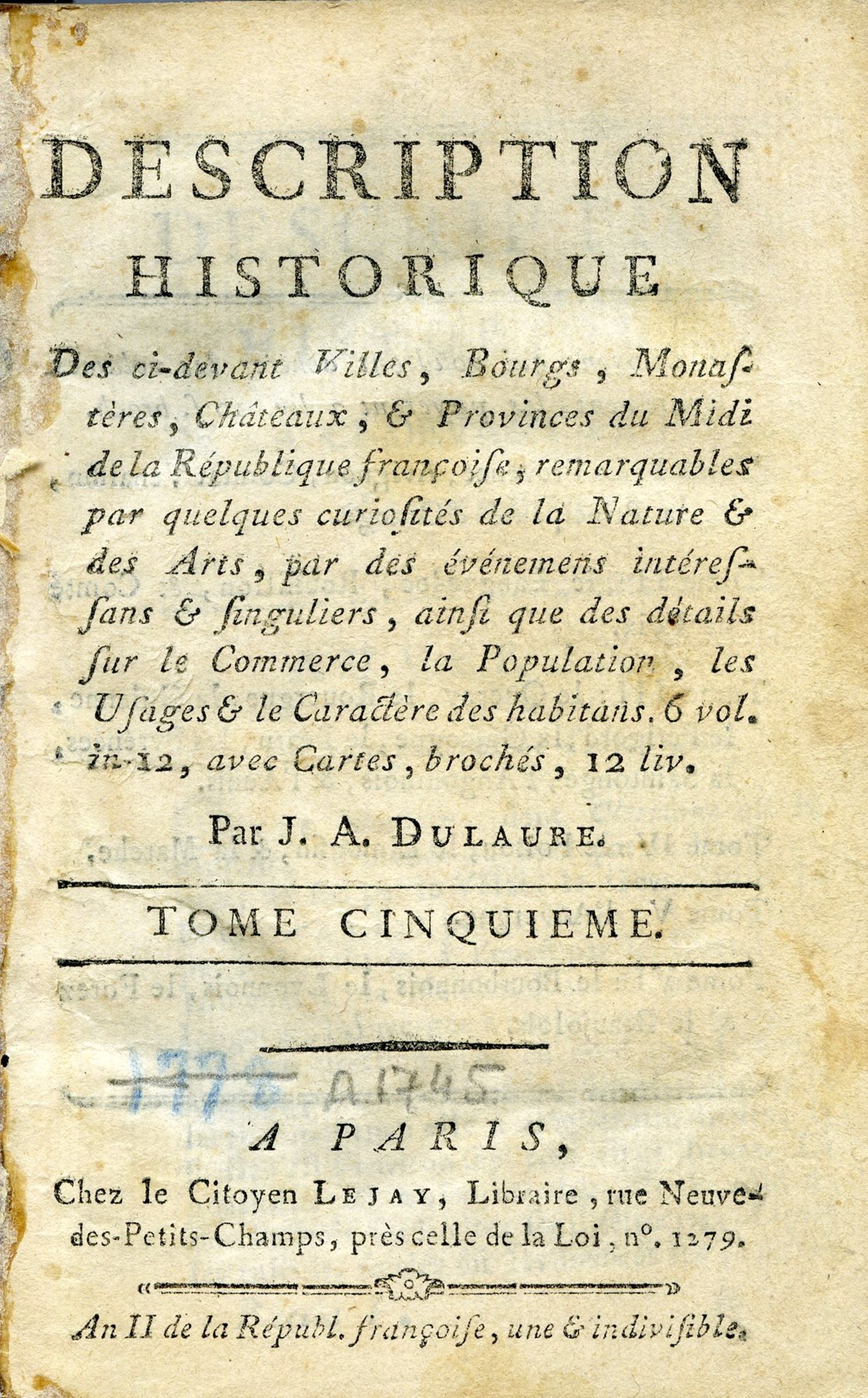 Le Clermontois Jacques-Antoine Dulaure (1755-1835) publie en l’an II le tome V de la Description historique des ci-devant villes, bourgs, monastères, châteaux et provinces du Midi de la République françoise… Sur les 603 pages que compte le volume consacré à l’Auvergne, pas moins de 557 portent sur la Basse-Auvergne, tandis que les 46 restantes forment la portion congrue, naturellement superficielle, de la Haute-Auvergne.