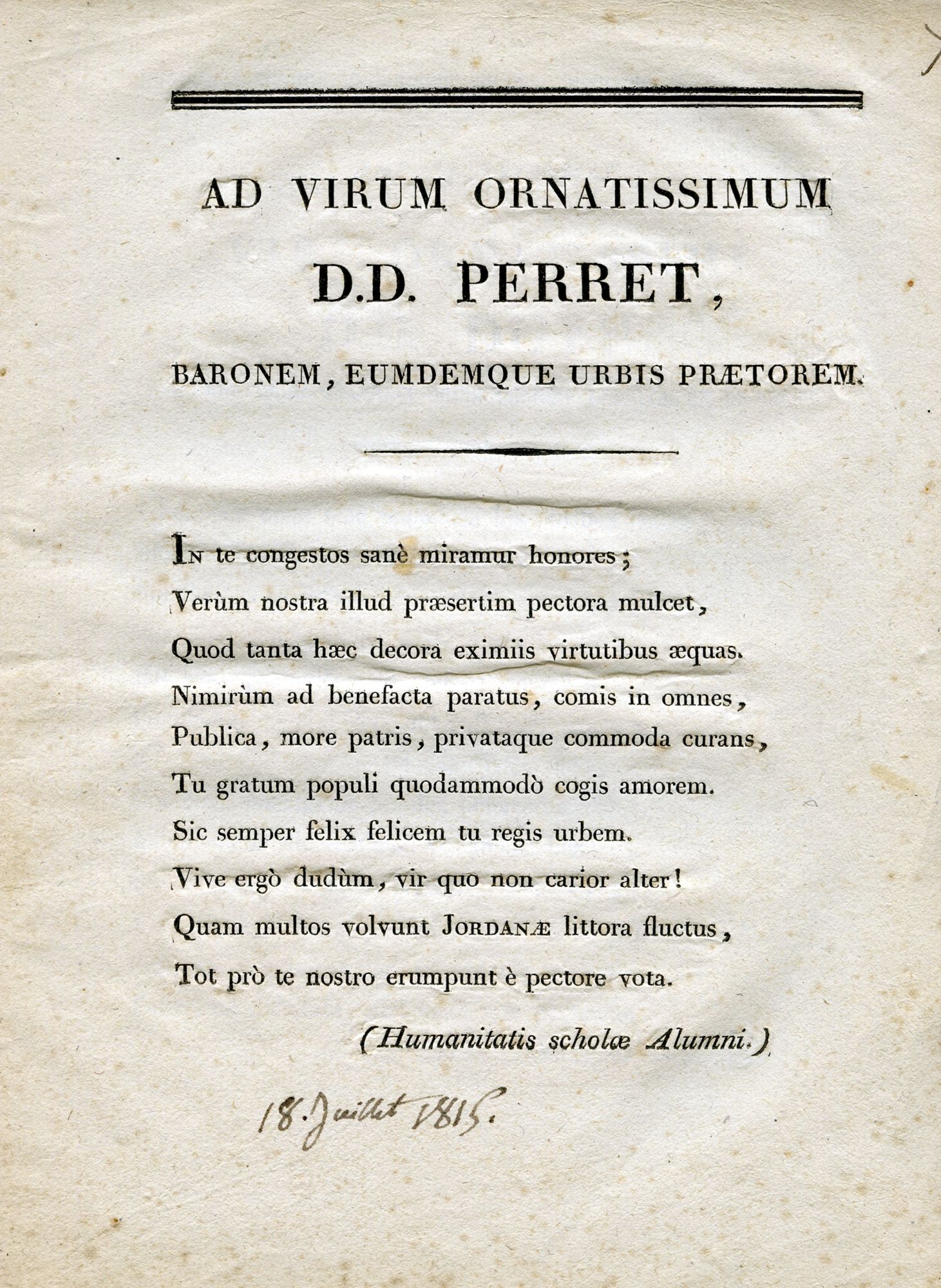 Le poème latin à la gloire du baron Perret, maire de la ville, se termine ainsi : « Aussi nombreux que les flots qui roulent sur les rives de la Jordanne sont les vœux qui sortent pour toi de nos cœurs ».