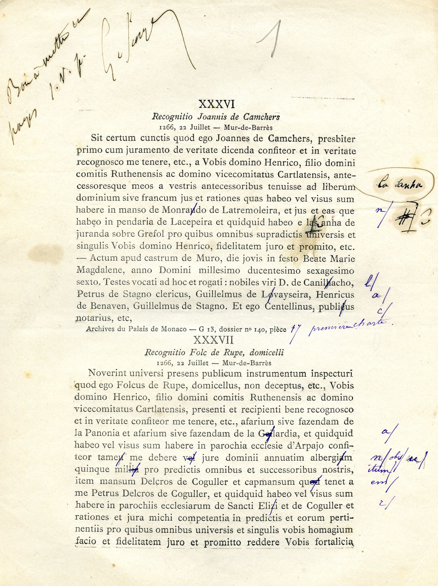 Manuscrit et épreuve des Documents historiques relatifs à la vicomté de Carlat : recueillis et publiés par ordre de S.A.S. le prince Albert Ier par Gustave Saige et le comte de Dienne, Monaco, 1900.