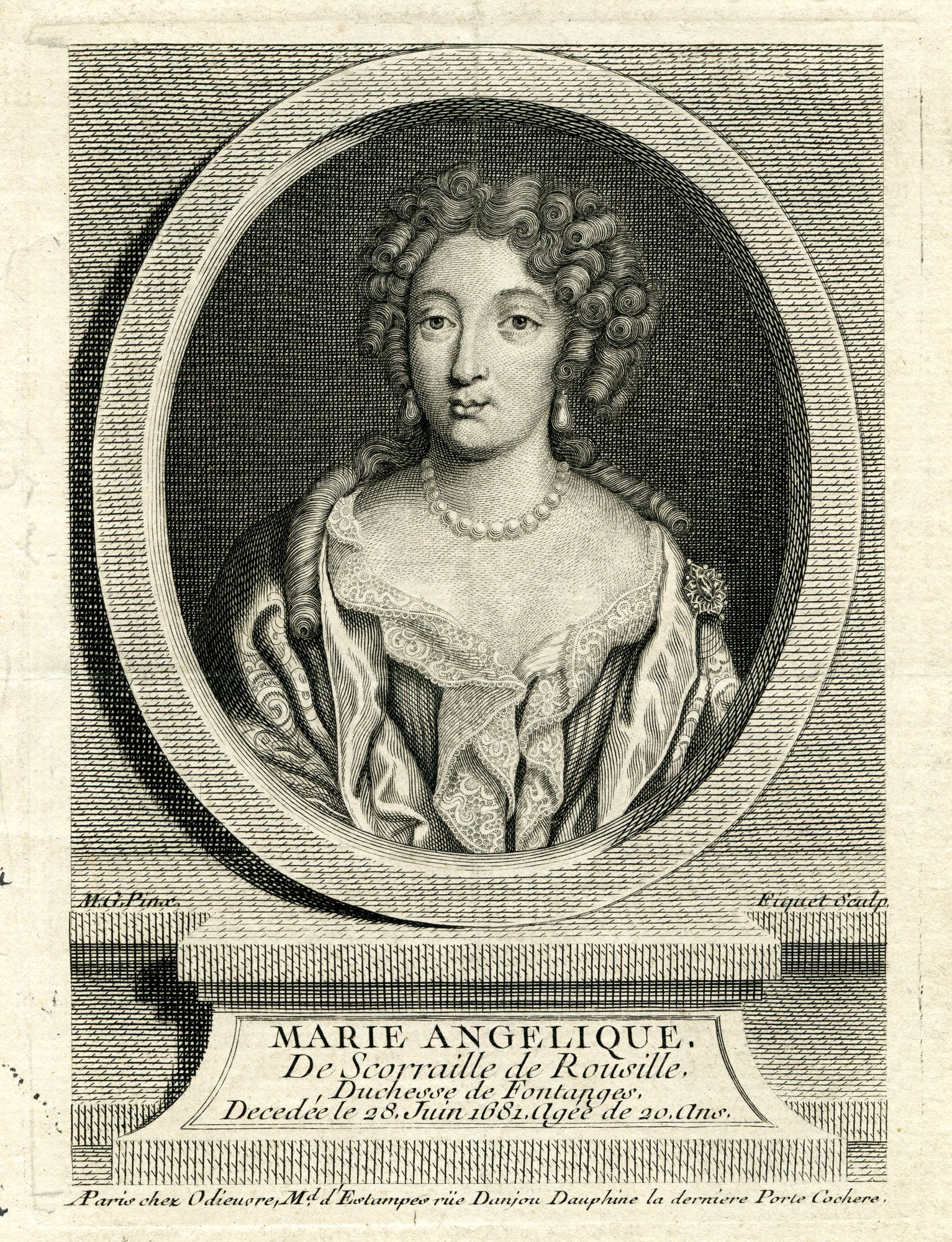 Marie-Angélique de Scoraille de Roussille arrive à la cour en 1679, à l’âge de 17 ans. Mme de Montespan voit tout le parti qu’elle peut tirer de cette ravissante créature pour détourner le Roi de Mme de Maintenon, en espérant qu’il s’en lassera vite et reviendra dès lors à elle. Mais le Roi prend goût à la demoiselle, qui accouche en janvier 1680 d’un enfant mort-né. Sa santé et sa beauté s’altèrent ; le Roi lui fait cadeau du titre de duchesse et d’une rente. Sa mort en 1681, causée par ses couches, fut longtemps entourée d’une suspicion d’empoisonnement.
