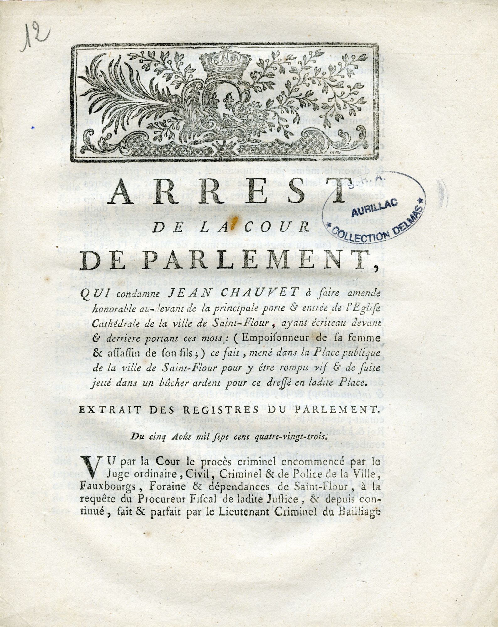Jean Chauvet, journalier de Villedieu, a acheté de l’arsenic à Saint-Flour le 19 mai 1783 ; il l’a mis dans le riz de sa femme Marguerite Jarlier, puis a étranglé leur fils Jean. Condamné le 28 juin 1783 par le bailliage de Saint-Flour à la peine de mort, il a fait appel au parlement de Paris, qui a confirmé la sentence par arrêt du 5 août 1783.