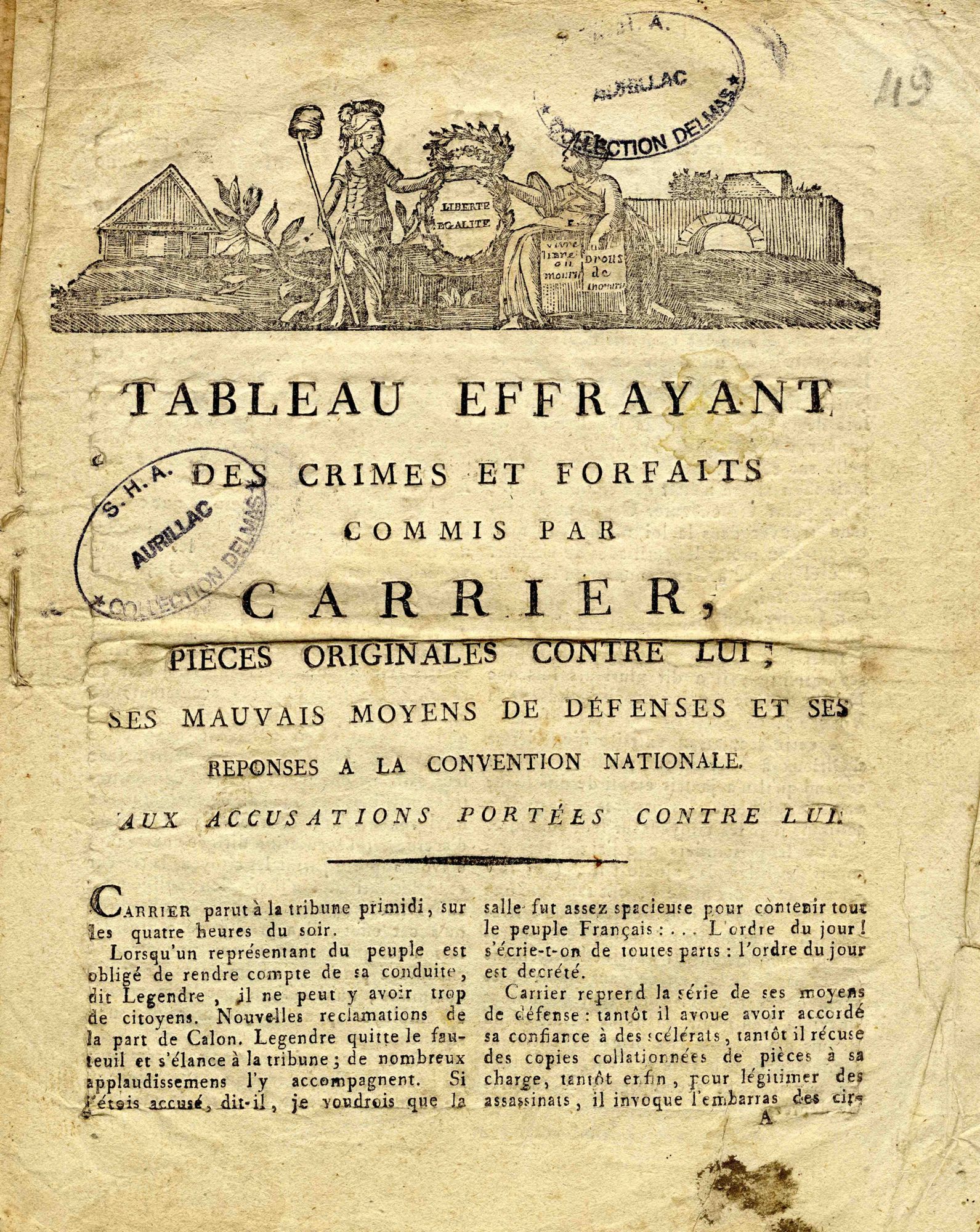 Plus officiellement paraît un Tableau effrayant des crimes et forfaits commis par Carrier…. On y apprend des détails sur les « mariages républicains » dans la « baignoire nationnale » (la Loire). En se désolidarisant de Carrier, la république thermidorienne faisait de « Caligula-Carrier » un monstre utile, une victime expiatoire commode qui dédouanait ses anciens amis et affermissait leur pouvoir.