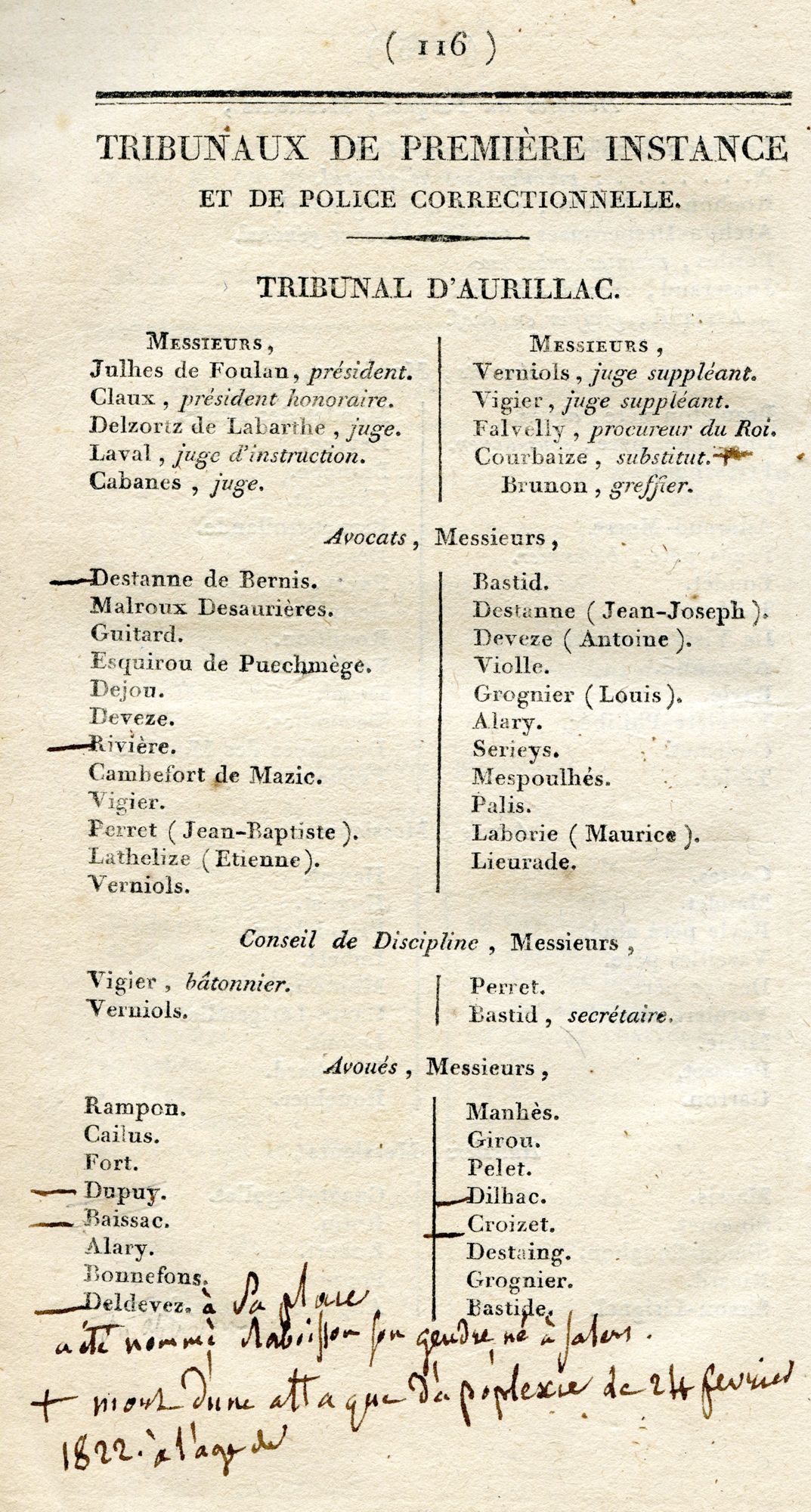 On défend toujours aux enfants d’écrire sur les livres. Et pourtant l’historien est bien content de retrouver et d’étudier les annotations portées sur les livres anciens. Il s’agit ici de J.-B. Lakairie, chroniqueur aurillacois, qui porte sur cet Annuaire statistique, véritable mine d’information, les modifications, adjonctions et corrections qui lui semblent d’imposer.