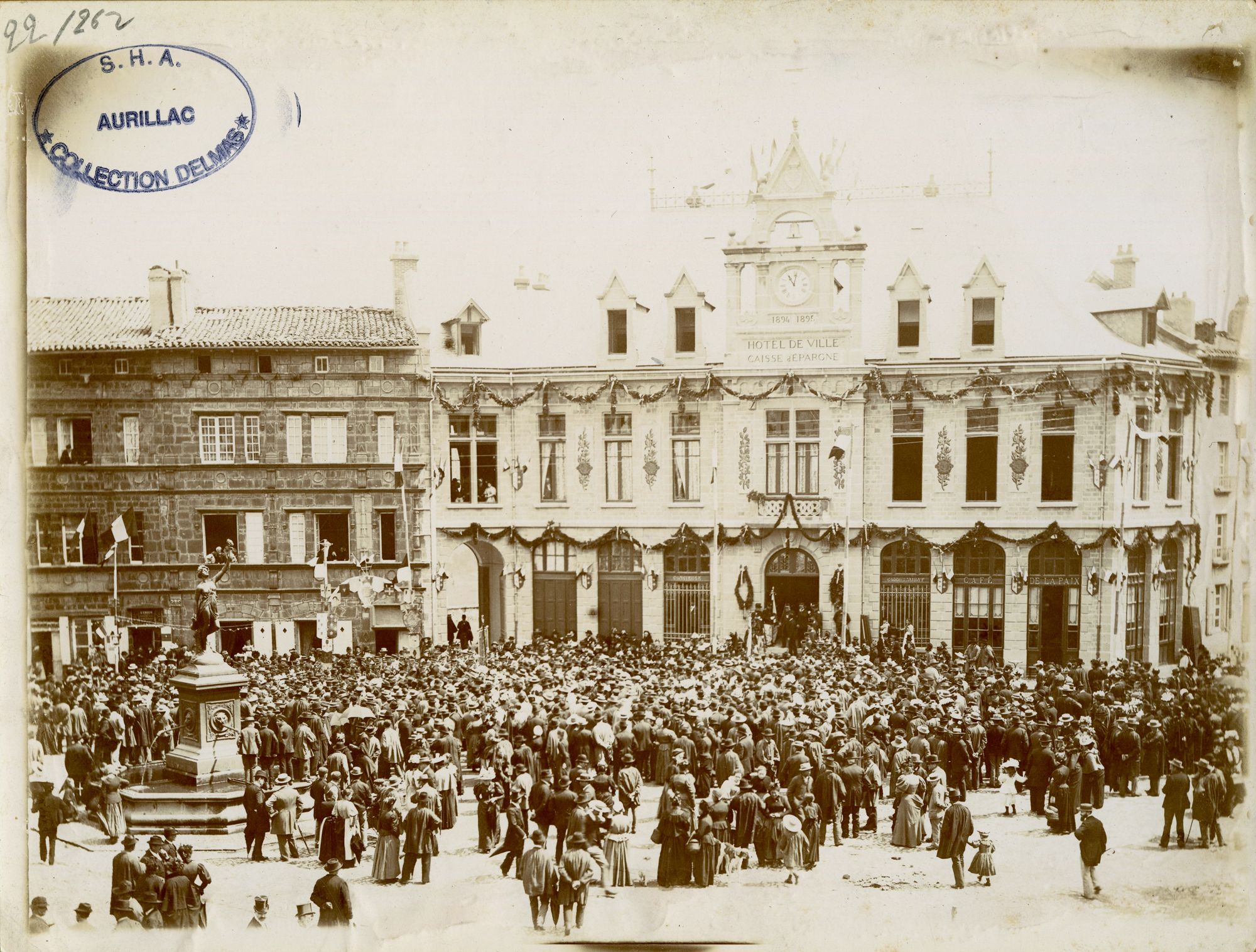 A côté de bourgeois (coiffés de melons ou de huit-reflets), on distingue sur la place, devant la maison consulaire (aujourd’hui musée Douët) et le bâtiment flambant neuf, des hommes en blouse.