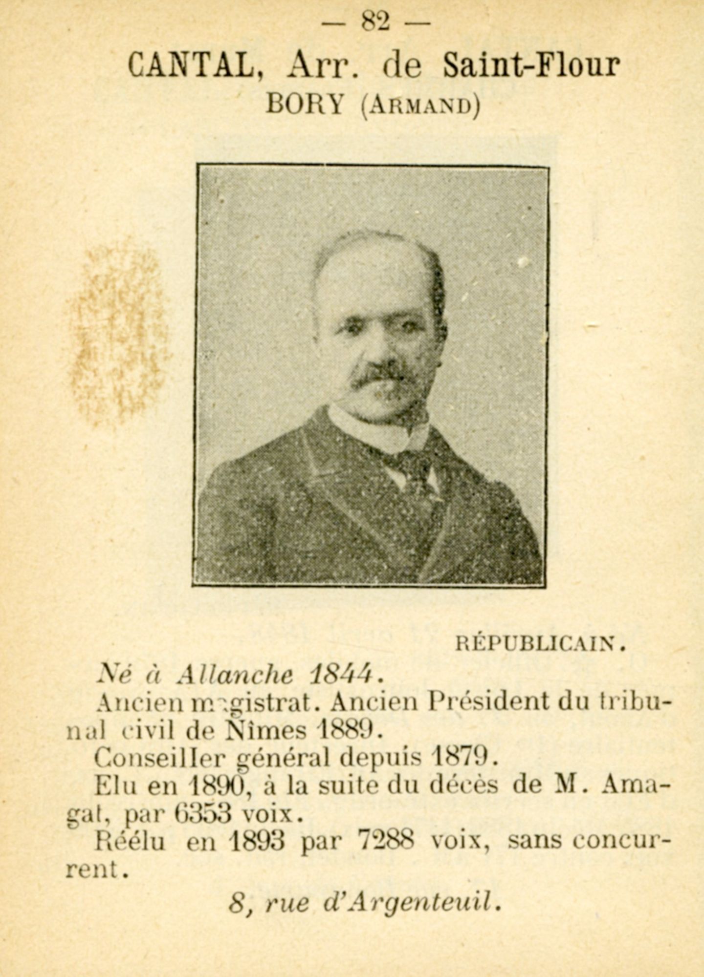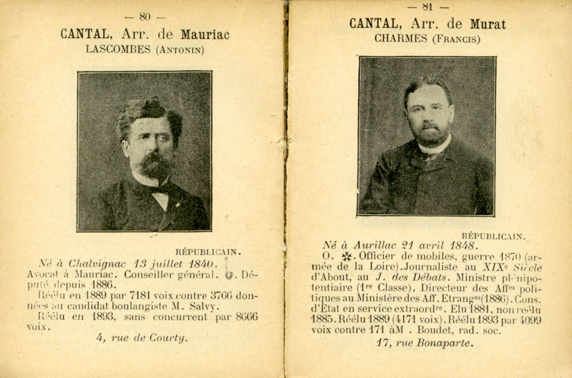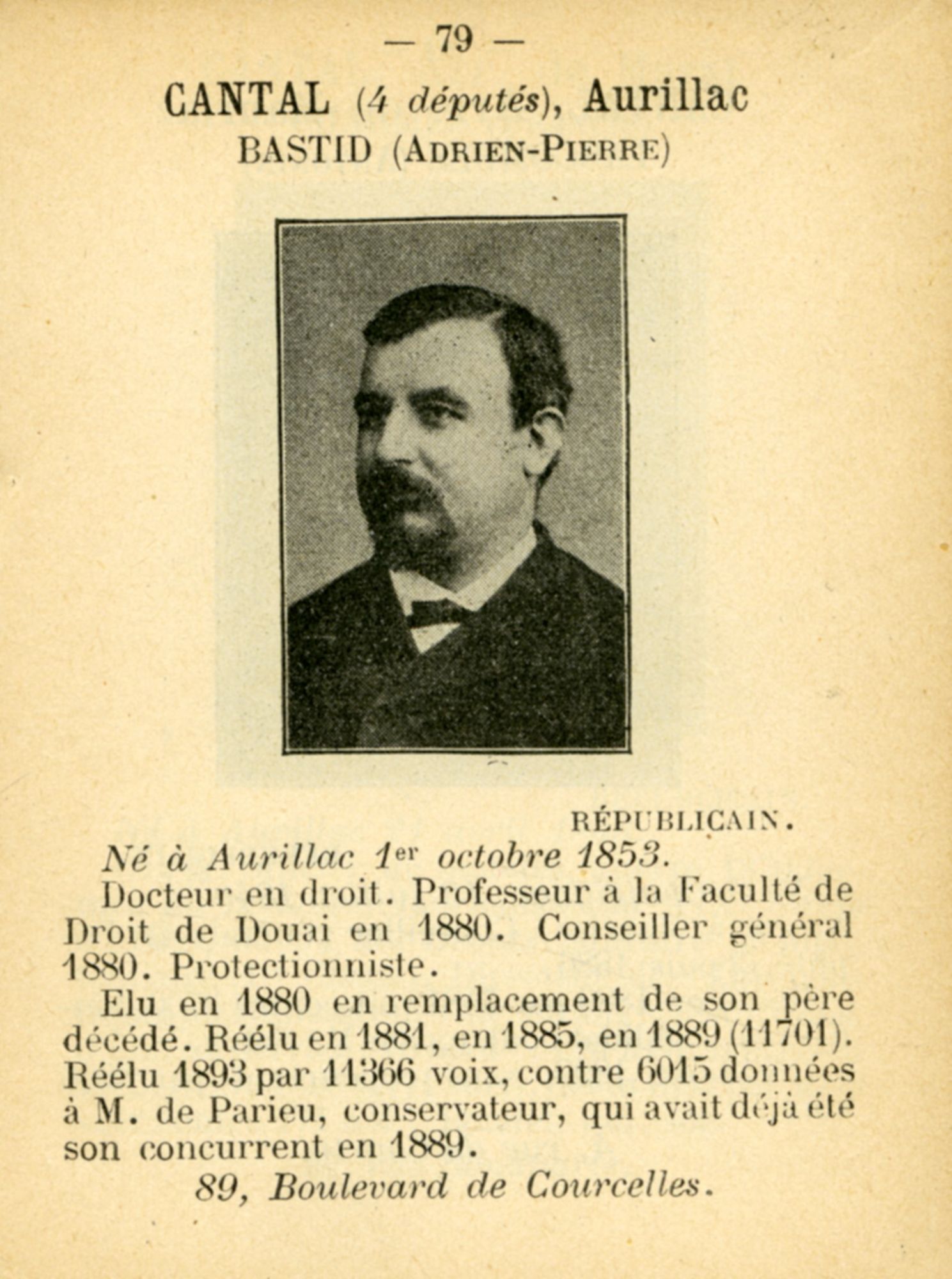 Le Cantal compte alors quatre députés, un par arrondissement : Adrien-Pierre Bastid (Aurillac, professeur de droit), Antonin Lascombes (Mauriac, avocat), Francis Charmes (Murat, diplomate et conseiller d’État) et Armand Bory (Saint-Flour, magistrat), tous républicains.