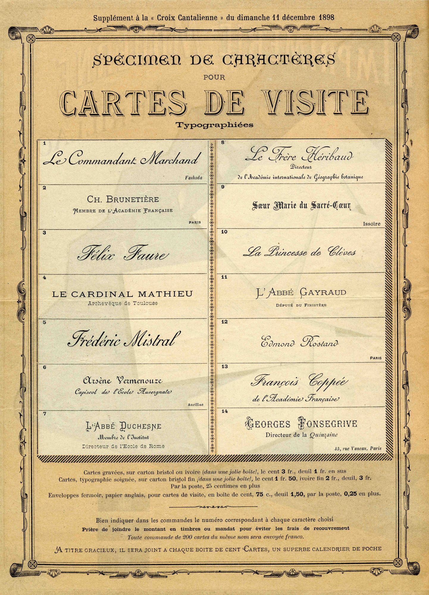 L’imprimerie Moderne est aujourd’hui fusionnée avec l’imprimerie Gerbert ; l’ensemble s’appelle désormais Albedia, et c’est elle qui imprime la Revue de la Haute-Auvergne. Des échantillons flatteurs permettent de dater avec une certaine précision cet échantillon. Jean-Baptiste Marchand (qui s’illustra à Fachoda) fut nommé commandant en 1898 et François-Désiré Mathieu cardinal en 1899 ; Félix Faure mourut en 1899 – mais la princesse de Clèves était morte depuis longtemps…