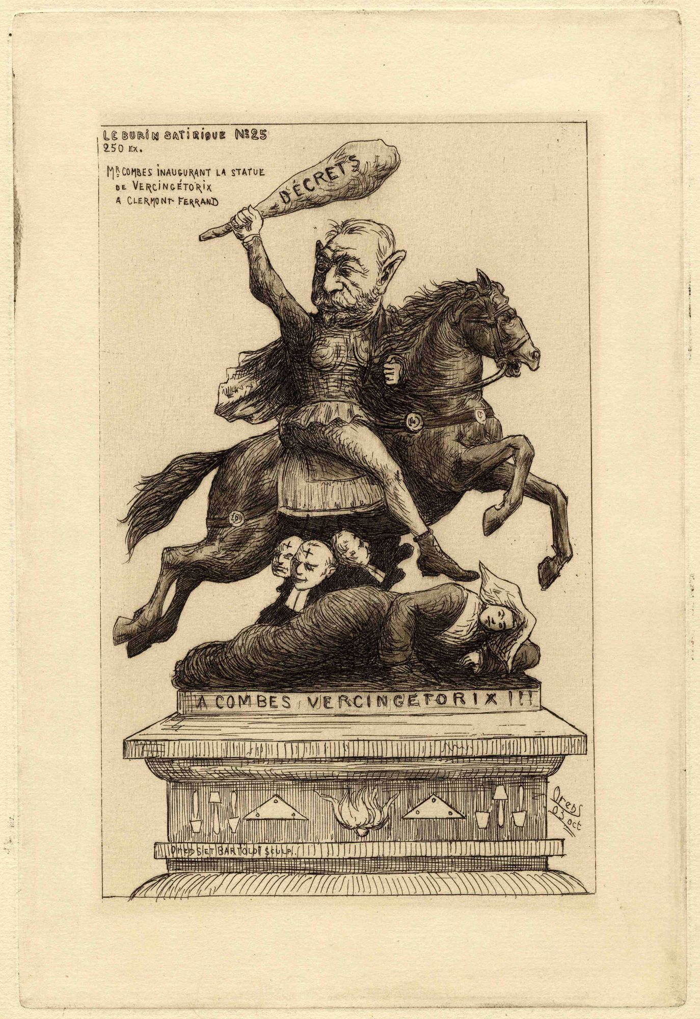 Emile Combes (1835-1921) est président du Conseil depuis 1902. Il applique scrupuleusement un programme de lutte anticléricale. Le 27 juin 1902, les décrets Combes font fermer plus de 2500 écoles confessionnelles en France. C’est pourquoi Combes, travesti par le caricaturiste Orens en chef gaulois sur un cheval fougueux, et brandissant un gourdin portant l’inscription « DECRETS » au lieu du glaive de Vercingétorix, écrase sans les regarder une religieuse et des prêtres.