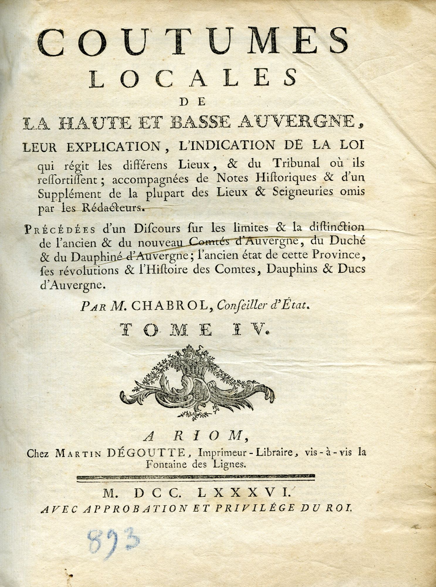 A BIB 893, Coutumes locales de la haute et basse Auvergne…, t. IV, Paris, 1786.