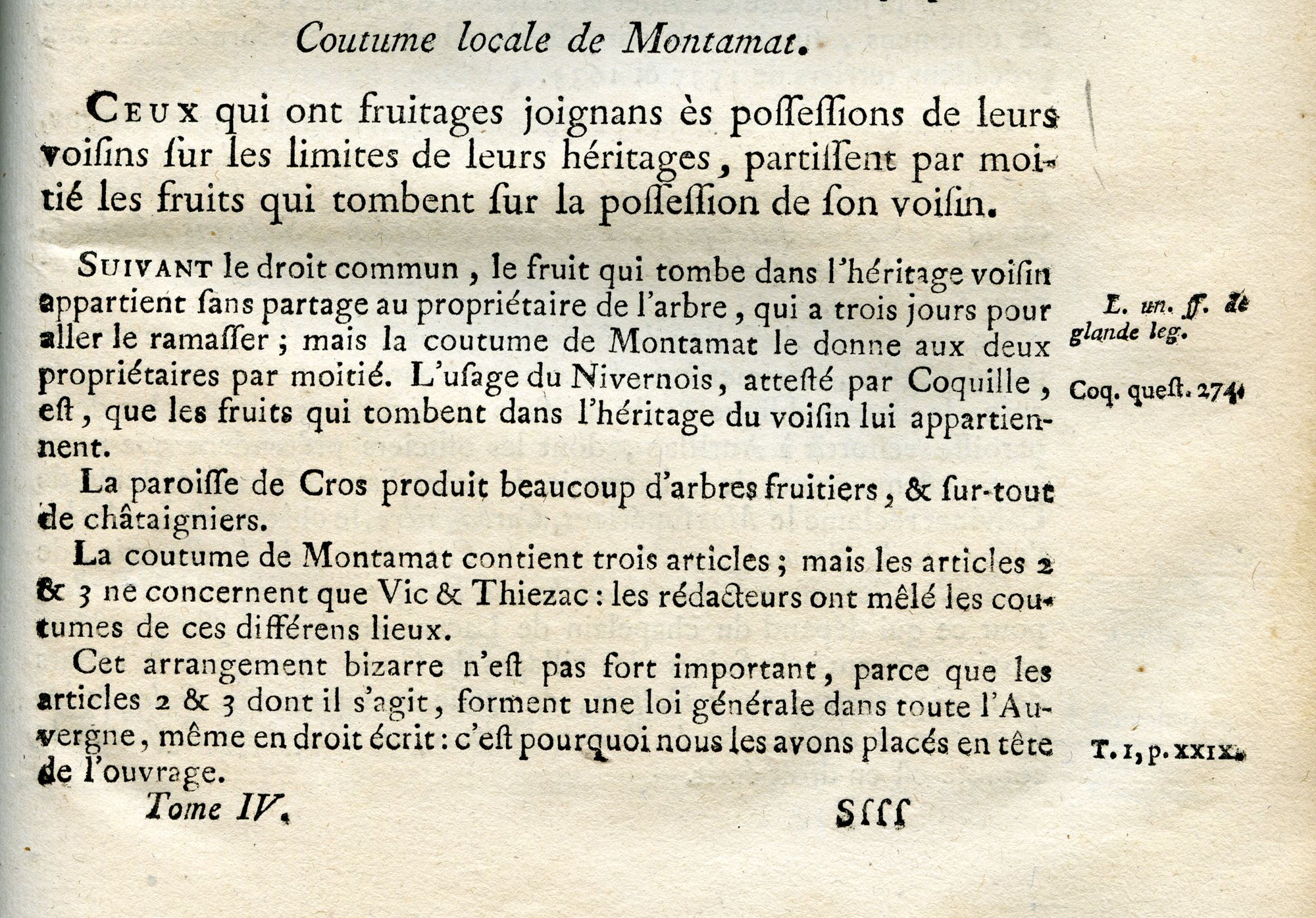Guillaume-Michel Chabrol (1714-1792), conseiller d’État, donne un commentaire de la coutume d’Auvergne, qui avait été rédigée en 1510. L’Auvergne était partagée entre doit coutumier et droit écrit. Commentant les coutumes locales (en privilégiant la Basse-Auvergne), imprimées dans un caractère plus important, Chabrol donne des détails historiques, voire ethnographiques, sur les lieux qu’il étudie. La question des fruits qui tombent dans le jardin du voisin est un problème classique. Elle trouve une solution originale à Montamat (commune de Cros-de-Ronesque).