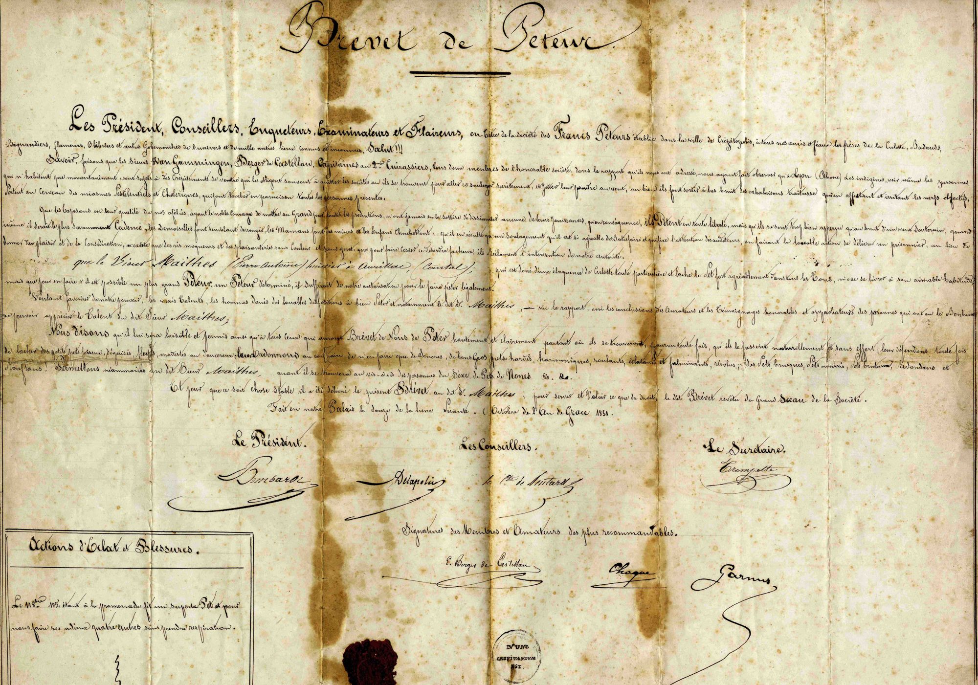 La compagnie des francs péteurs, qui existait depuis le XVIIIe siècle, persiste au milieu du XIXe siècle, comme l’atteste ce brevet de péteur, décerné en octobre 1851. Le préambule de l’acte souligne qu’en entendant un pet, « les demoiselles font semblant de rougir », de sorte que péter, au lieu d’être une « délivrance » donnant du plaisir, oblige au contraire les péteurs à dissimuler « leurs jouissances ». Pierre-Antoine Mailhes, huissier à Aurillac, reçoit par conséquent le droit de « péter hautement et clairement partout où » il se trouvera.