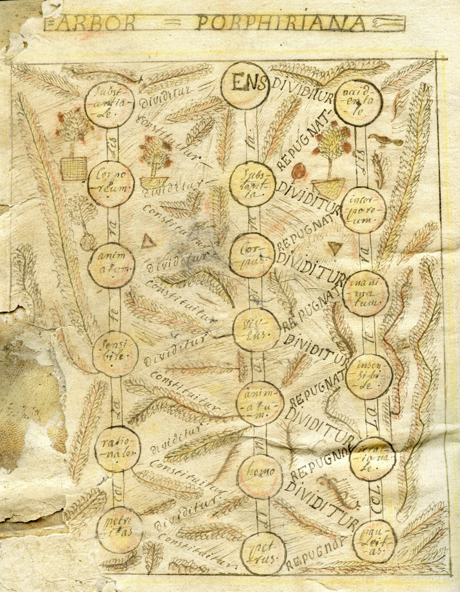 L’arbre de Porphyre, due au philosophe néoplatonicien du IIIe siècle Porphyre mais traduite et popularisée par Boèce, comprend trois colonnes de mots. La rangée du milieu comprend les genres, hiérarchisés depuis le genre suprême (Ens) jusqu’au genre inférieur (Petrus). Les colonnes de droite et de gauche forment les différences. Entre l’Essence et Pierre se trouvent en ligne directe (linea directa) des niveaux successifs (Substance, corps, vivant, animé, homme). Chaque genre se divise (dividitur) en deux. Par exemple l’Essence peut être substantielle ou accidentelle ; la substance (en-dessous de l’essence sur la colonne médiane) est constituée (constituitur) par l’ens substantiale, tandis qu’elle diffère (repugnat) l’ens accidentale. On descend la linea directa par différenciations successives (le vivant est sensible ou insensible ; le vivant sensible constitue l’animé ; l’animé est rationel ou irrationnel ; l’animé rationel constitue l’homme ; l’homme est pétrinité ou paulinité ; la pétrinité constitue Pierre, qui répugne à la paulinité).
