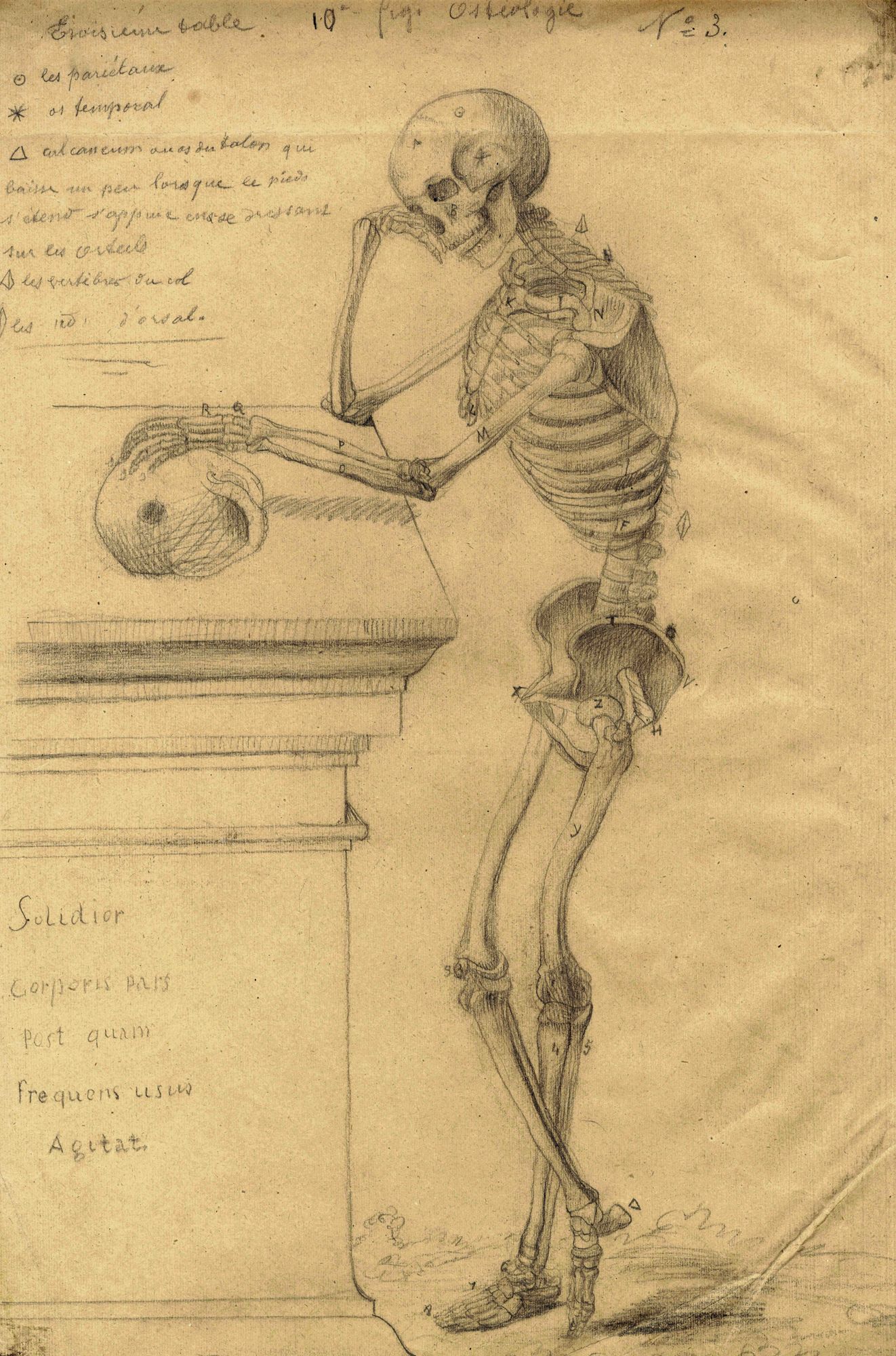 Ce dessin anonyme au crayon est une planche d’ostéologie à usage pédagogique, copie d’une planche gravée. La crédence porte une inscription suivante dont la traduction est malaisée : « Solidior corporis pars postquam frequens usus agitat » (« La partie du corps est plus solide quand elle a été activée par un mouvement fréquent »). Cette phrase latin est inspirée de Sénèque (De providentia, 4, 12) : « Solidissima corporis pars est quam frequens usus agitavit » (La partie la plus solide du corps est celle qu’active un usage fréquent). L’ostéologie détourne ici une maxime stoïcienne que Sénèque applique à la morale.