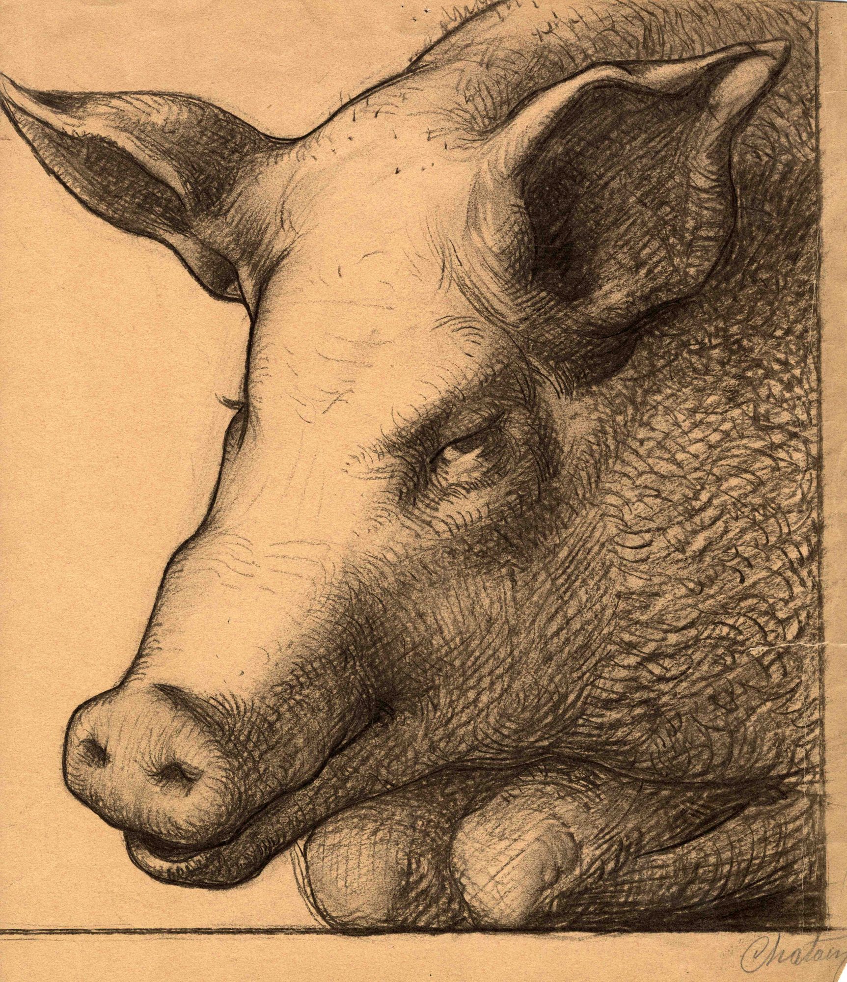 Un usage très ingénieux des hachures permet de rendre à la fois le volume de la tête et la texture de la peau comme la disposition des soies du porc. Si la tête est évocatrice, en revanche l’œil est moins convaincu par les pattes de devant, repliées sous la tête, et qui donnent une impression de perspective faussée.