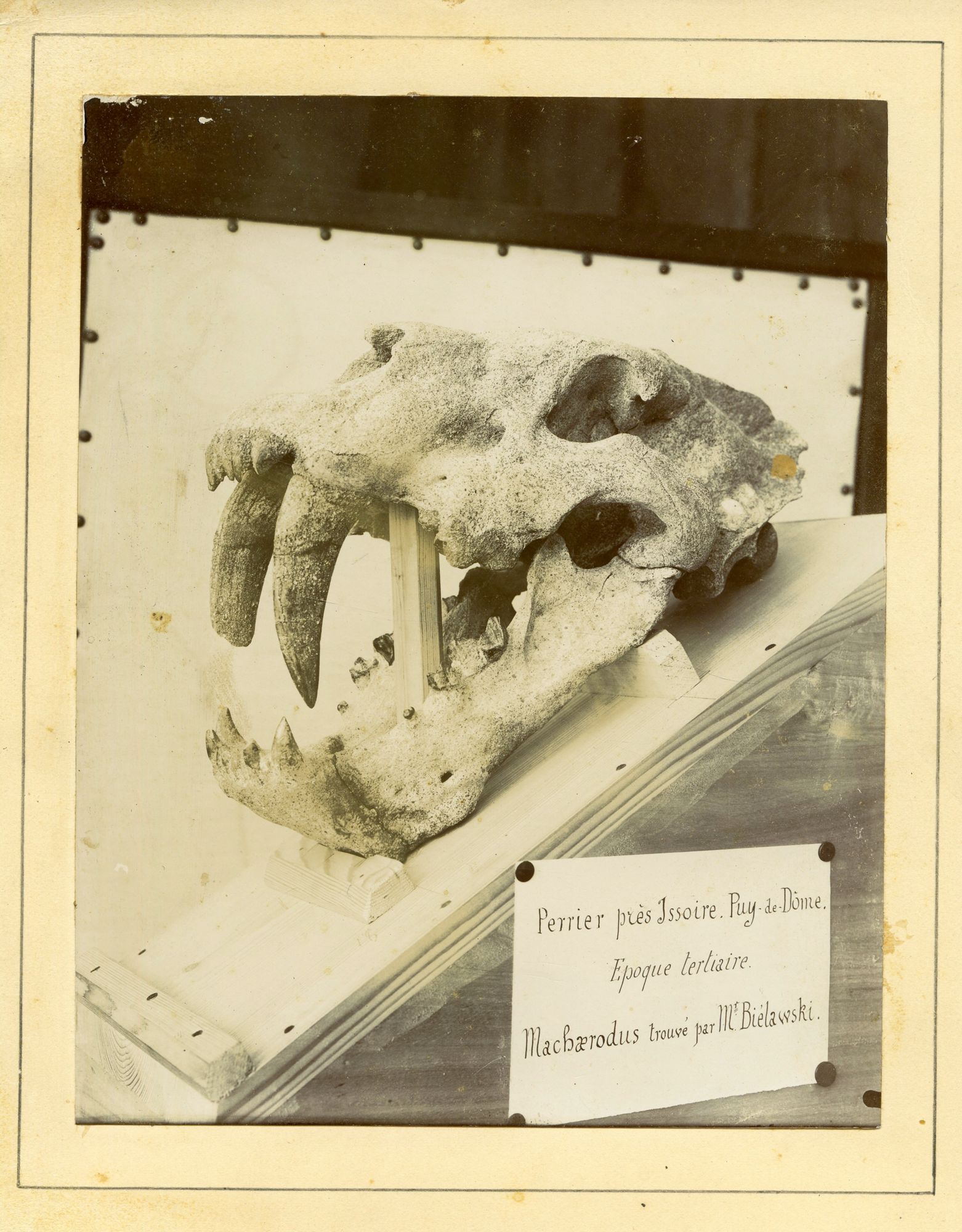 J.-B. M. Biélawski publie, dans le dernier quart du XIXe siècle, le fruit de ses découvertes géologiques et paléontologiques. La montagne de Perrier, près d’Issoire, a recélé « des ossements fossiles d’Hippopotame, d’Hipparion, d’Antilopes (trois espèces au moins), de cerfs, de bovidés et autre ruminants, de félidés, de hyénidés, de proboscidiens », comme l’indique la brochure publiée en 1902, qu’Aymar possédait (A BIB 224). La tête fossilisée de Machaerodus, longue de 35 cm, est le clou de ses trouvailles. Ses canines faisaient de ce grand félin un redoutable carnivore.