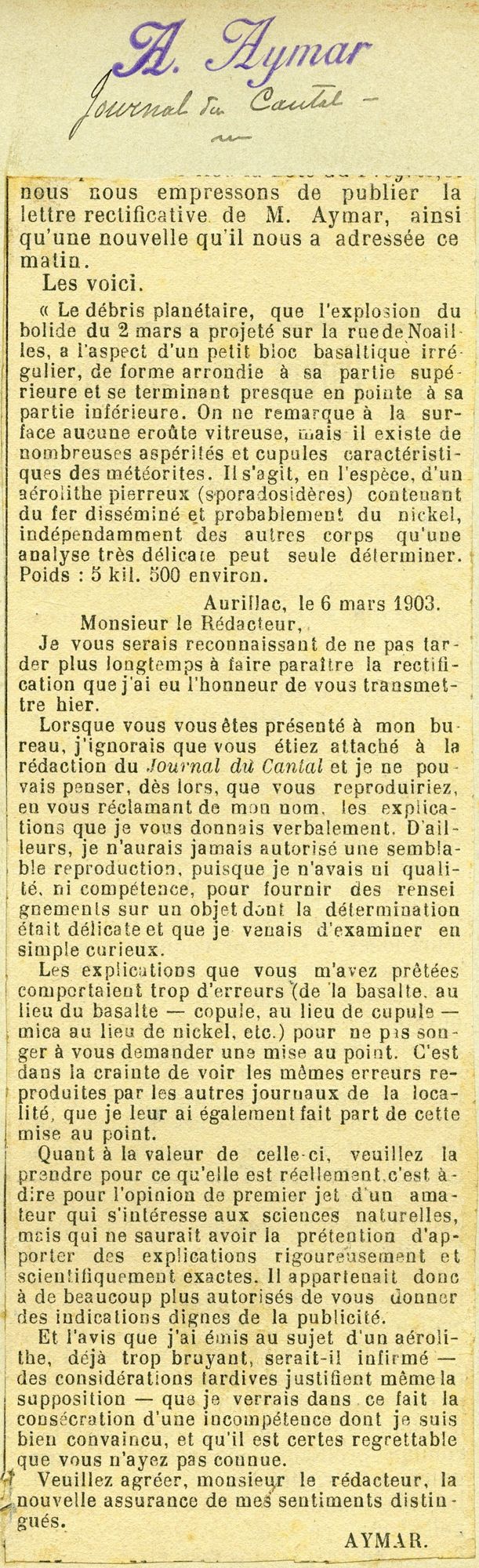 Ce matin de mars 1903, la science est pratiquement sur la tête d’Alphonse Aymar, puisque c’est dans la cour de la maison du 9, rue de Noailles, siège de son administration des contributions directes, que l’on trouva au matin cet aérolithe de plus de 5 kg. Aymar parle vite de basalte, de nickel, de copule (au lieu de cupule !) ; il publie aussitôt une lettre rectificative, publiée par le Journal du Cantal, reconnaissant qu’il a écrit mû davantage par l’enthousiasme que par la science.