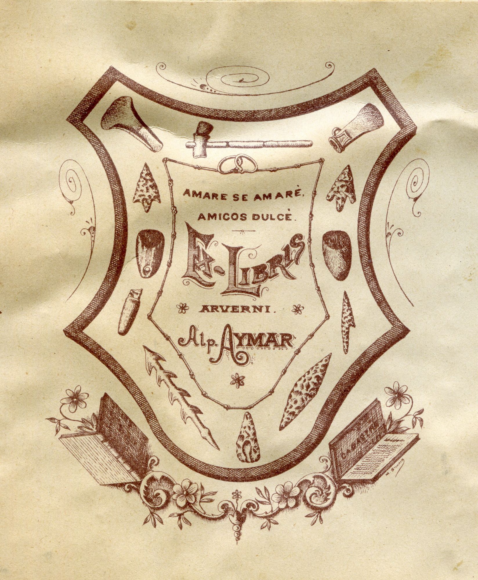 Cette marque de propriété est collée dans un précieux ouvrage de 1609, les œuvres de Sidoine Apollinaire. Dans un cartouche en forme d’écu, on peut lire « Amare se amare, amicos dulce » (S’aimer soi-même est amer, aimer ses amis est doux), suivi de « Ex-libris Arverni Alp. Aymar » (Des livres de l’Auvergnat Alphonse Aymar). Le cartouche est décoré de silex et de pierres préhistoriques ; il est environné de deux livres, dont l’un porte le mot « Cadastre ».