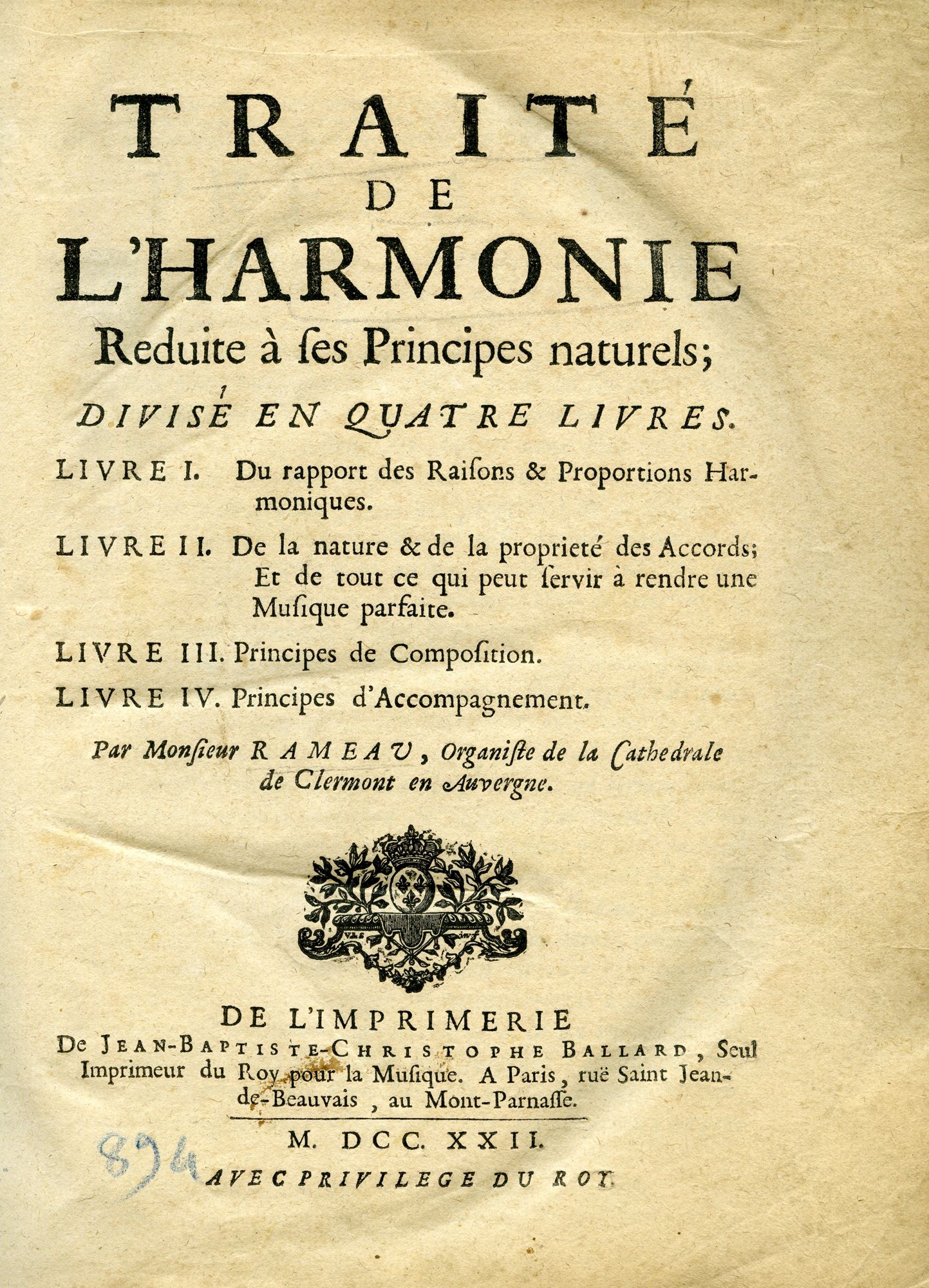 A BIB 894, Jean-Baptiste Rameau, Traité de l’harmonie reduite à ses principes naturels ; divisé en quatre livres, Paris, Jean-Baptiste-Christophe Ballard, 1722.