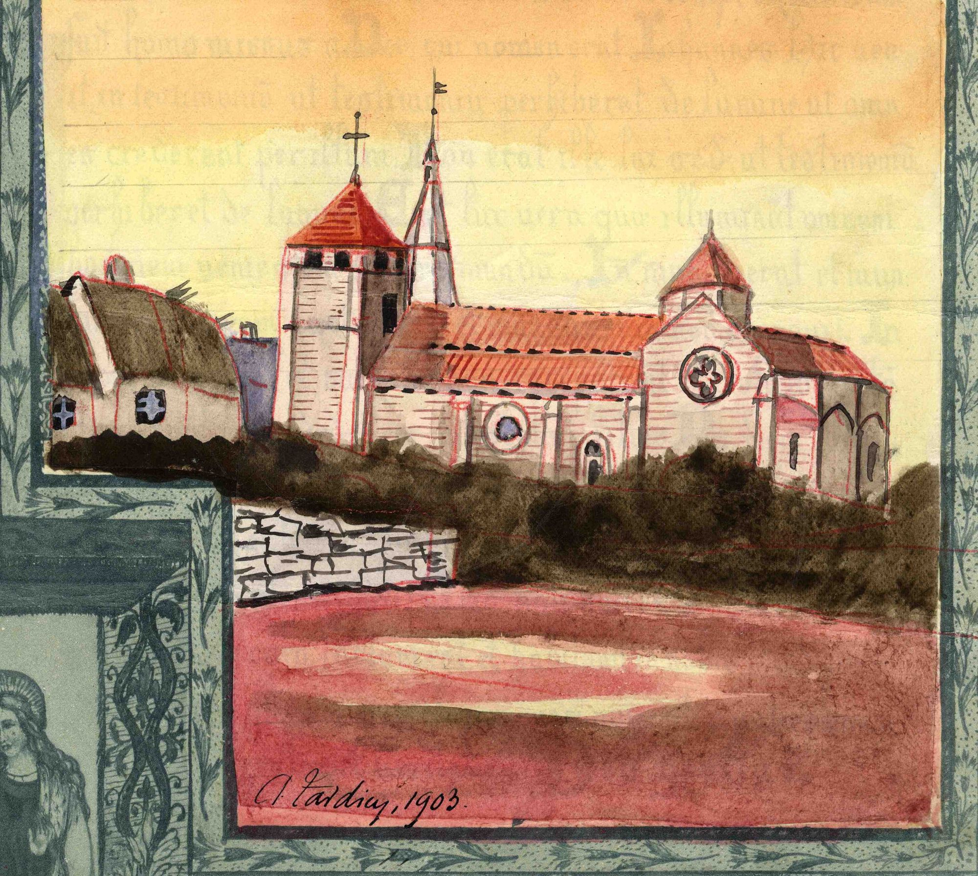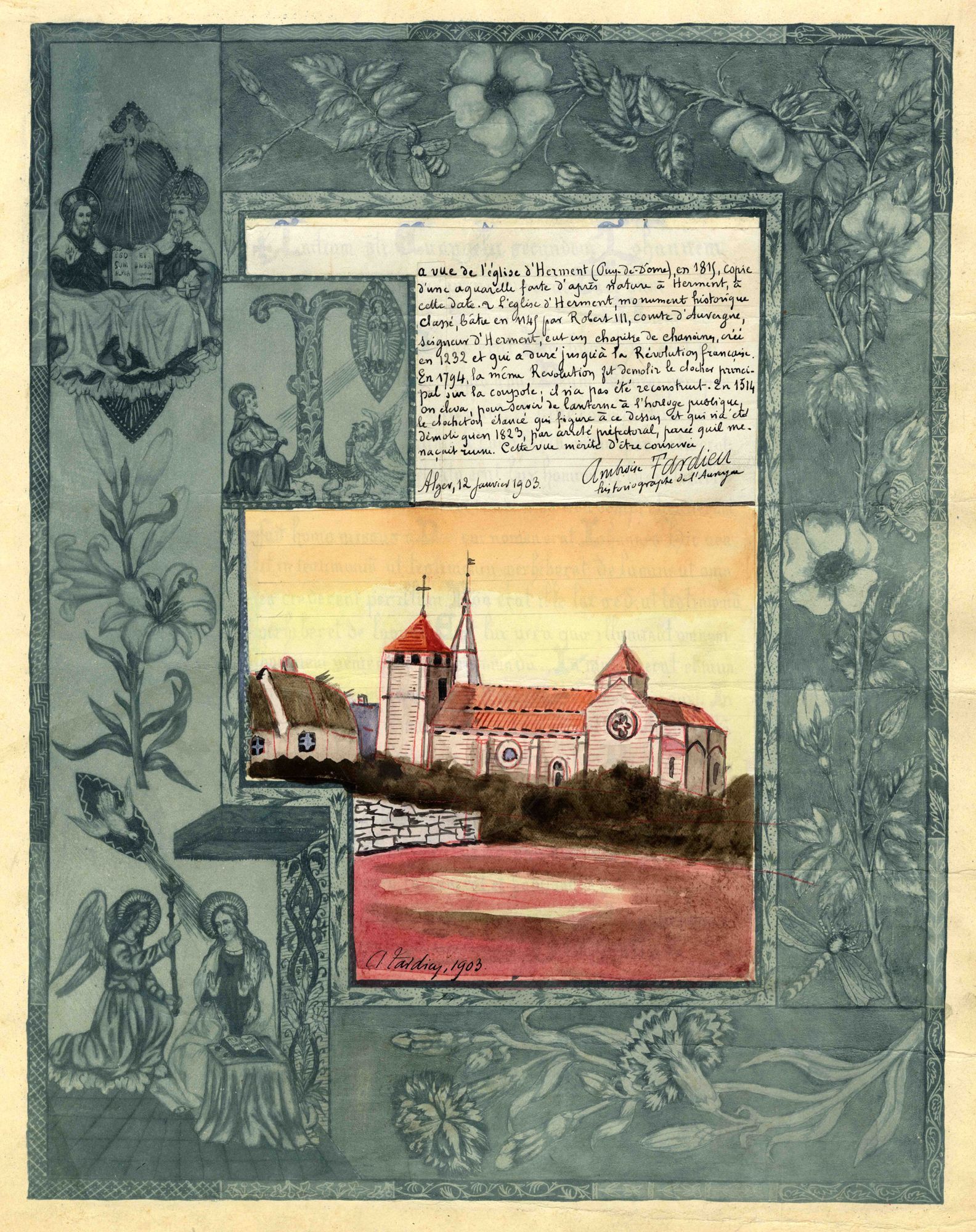 Ambroise Tardieu (1840-1912) s’intitule pompeusement « historiographe de l’Auvergne ». Depuis Alger où il passe les hivers de la fin de sa vie, il adresse copie d’une aquarelle de 1815, qui montre l’église d’Herment (chef-lieu de canton de l’arrondissement de Clermont-Ferrand) : le clocheton, construit en 1514 pour servir de lanterne à l’horloge publique, ne fut abattu qu’en 1823.